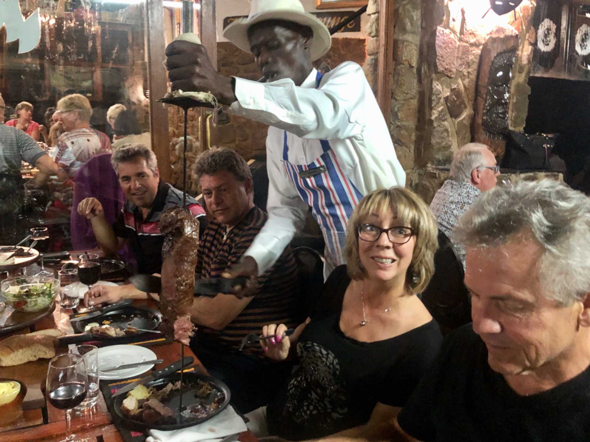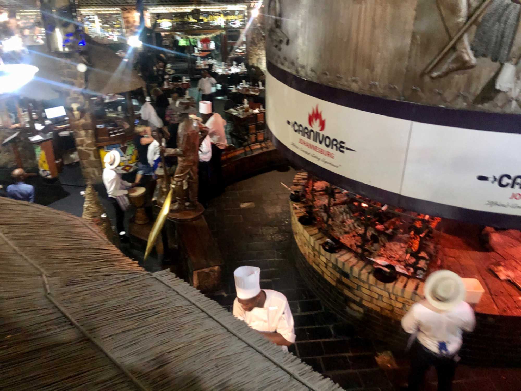 Ce soir, c’est le réputé restaurant Carnivore qui nous accueille. Initialement ouvert à Nairobi, au Kenya, le restaurant Carnivore de Johannesburg est situé dans un cadre naturel surplombant les collines Krugersdrop. Du foyer circulaire sis au centre du restaurant sont grillées une multitude de viandes variées, qui nous sortent un peu de notre cadre habituel. En effet, crocodile, zèbre, girafe, impala, autruche et kudu rôtissent lentement sur les braises, embrochées sur 52 lances Masai, côtoyant porc, agneau, bœuf, poulet et saucisses… Les serveurs, munis de ces lances, découpent les viandes de votre choix directement dans votre assiette et continuent de vous servir jusqu’à satiété. Quel souper! Et quelles découvertes! Nous nous sommes bien amusés et nous avons de belles photos. Martin a même décidé de faire le chef pour nos photos. C’était agréable de pouvoir goûter à notre choix toutes ces différentes viandes et cela encore une fois, le tout accompagné de très bons vins sud-africains. C’est un très grand restaurant pouvant accommoder beaucoup de personnes en même temps. Nous n’étions pas seuls et le service est tout aussi expéditif, ils ont l’habitude, c’est seulement nous qui ne sommes pas habitués. Quelques photos vous amuseront.