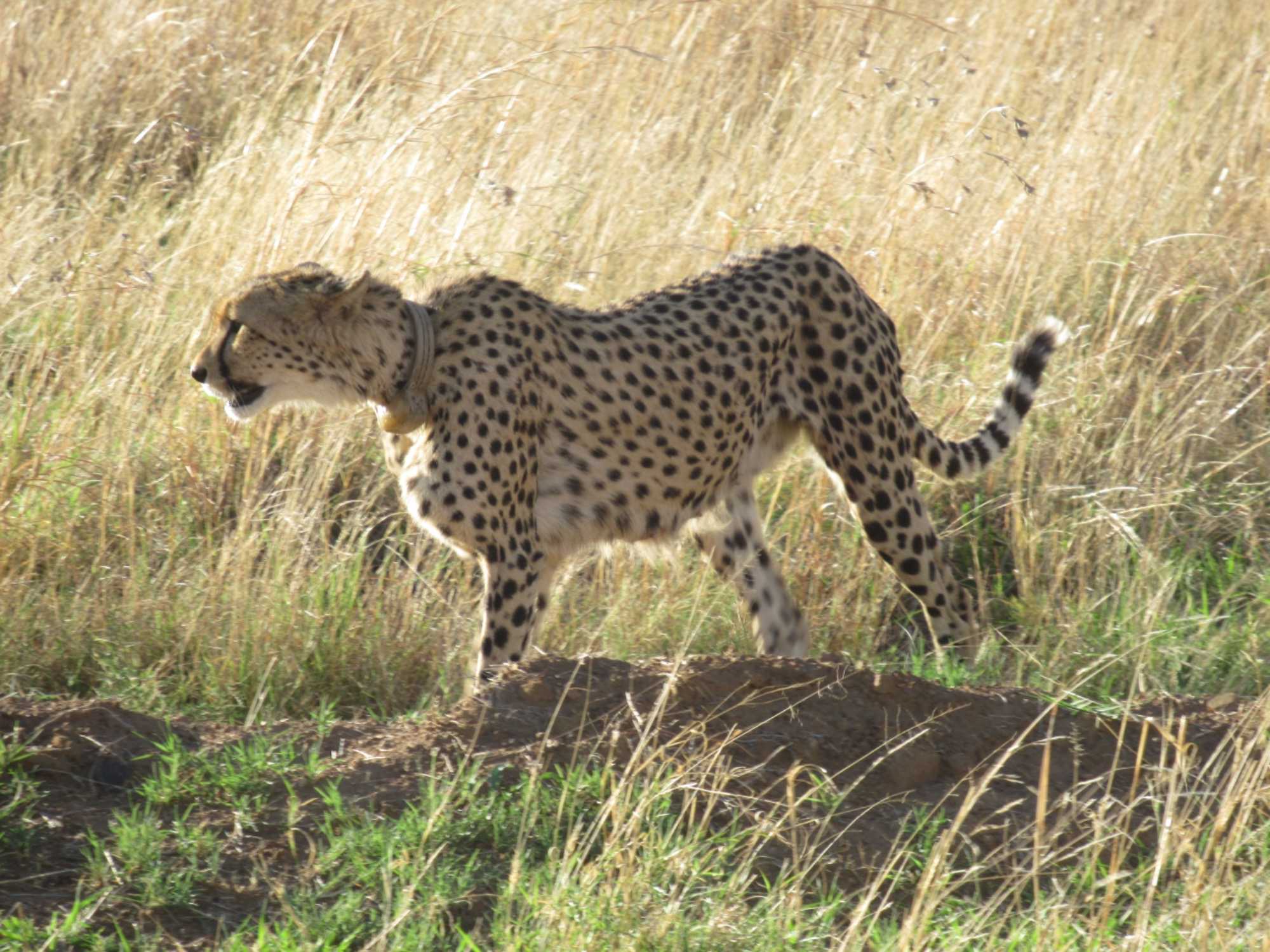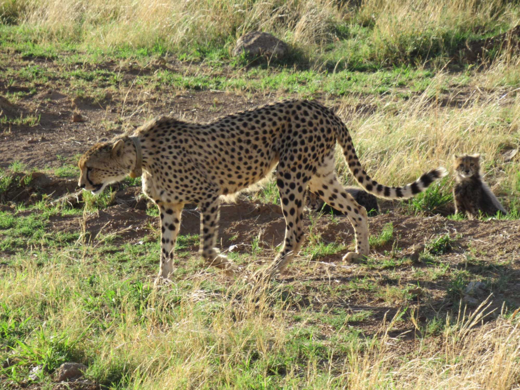 Après notre dîner au lodge, nous reprenons place dans nos véhicules 4X4 afin de retourner à la rencontre de nos amis les animaux. Une fois de plus, que c’est impressionnant de les voir dans leur habitat naturel, libres de leurs allées et venues… ce soir nous cherchons nos lions car Les Louises n’ont pas eu grande chance de voir les grands lions mâles. Nous commençons avec quelques zèbres et girafes mais le clou fût de voir 1 maman guépard avec ses 4 bébés qui jouaient. Pendant que nous étions occupés à prendre des photos de la maman et des bébés nous n’avions pas remarqué qu’un lion s’approchait de notre jeep en direction de la savane où était la maman et ses bébés. Notre guide nous avise et tout de suite on se met à suivre le lion qui avançait doucement dans la savane jusqu’au moment ou la maman guépard l’aperçut. Et là tout un spectacle nous a été servi! Le guépard qui, lorsqu’il aperçoit un lion préfère partir rapidement car il court si vite mais ici ce soir avec ses 4 bébés c’était une autre chose. La maman se lève et regarde le lion et s’empresse de tenter de le distraire afin qu’il n’approche pas de l’endroit où était les petits. Elle part après le lion et lui aussi c’était tout un spectacle. Ensuite elle l’entraîne plus loin et toujours plus loin avant de revenir vers ses bébés. Ce fût tout un moment de safari que j’ai réussi à capter sur vidéo. Même nos conducteurs de jeep voulaient la vidéo car c’est un moment unique et si rare qu’aucun n’avait vu cela avant ce soir. Nous sommes chanceux.