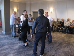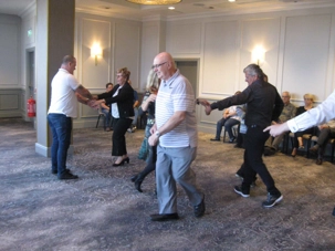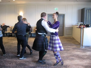 Vers la fin de l'après-midi, dans une salle de notre hôtel ,nous avions rendez-vous avec des musiciens et animateurs pour notre cours de danse écossaise. Il faut dire que la musique et la danse écossaise ne nous est pas entièrement étrangères car les rythmes ressemblent beaucoup à nos rigodons et quadrilles. Dès les premiers instants, on a senti qu'il y avait beaucoup de potentiel .... certains de nos voyageurs/voyageuses avaient surement du sang écossais .