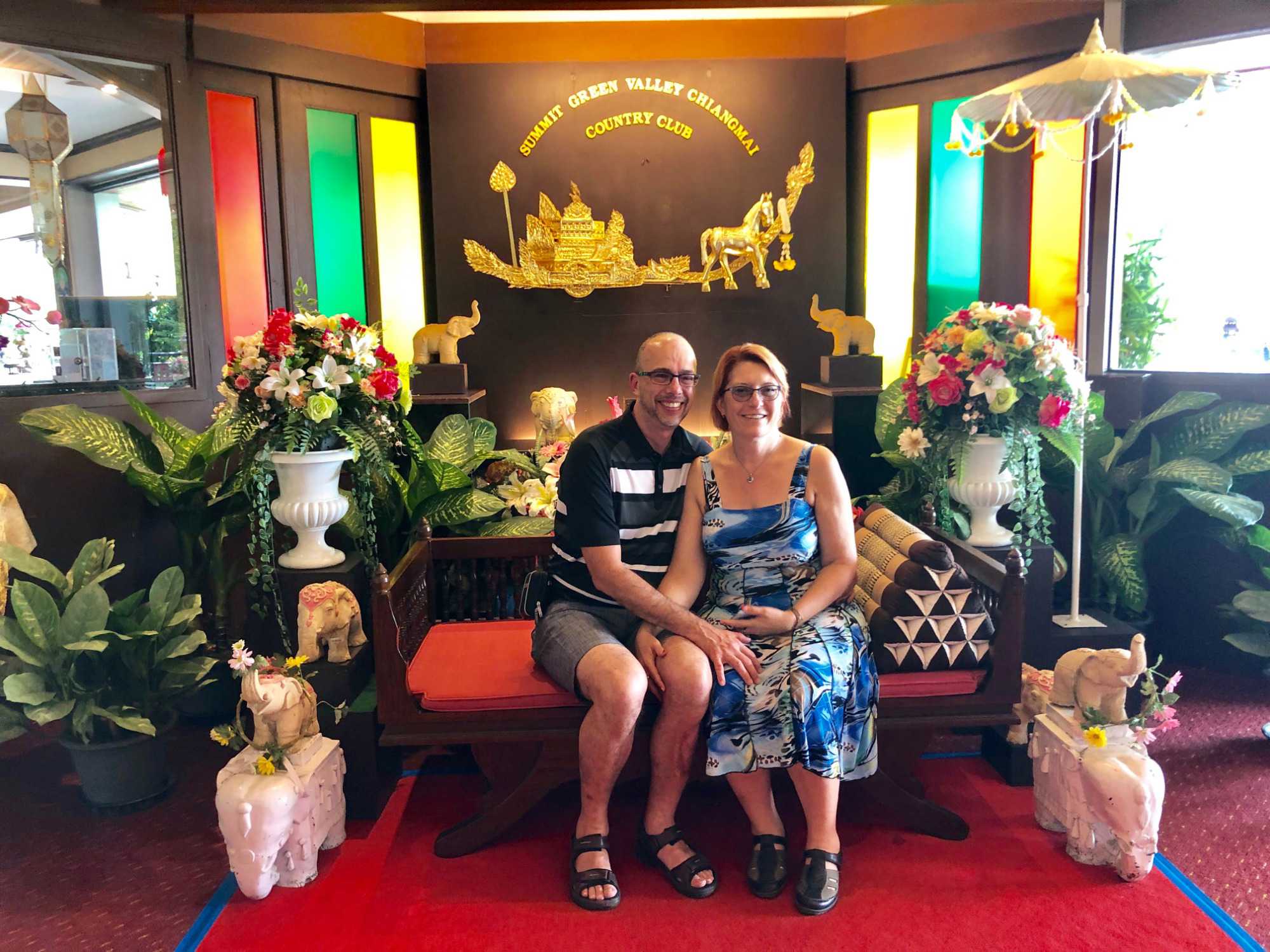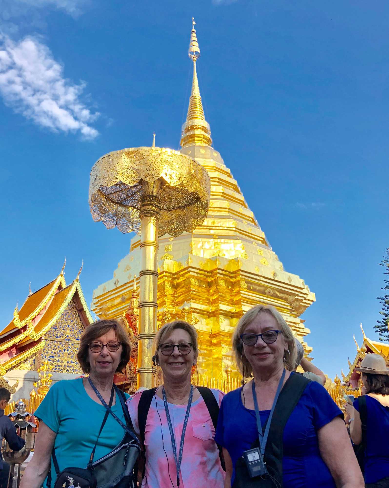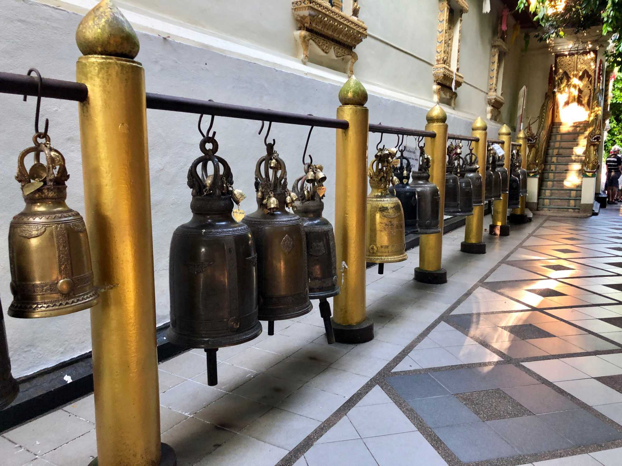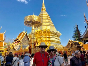En après-midi, nous avons visité le temple de Doi Suthep qui est la destination touristique la plus populaire à Chiang Mai, autant pour les Thaïlandais que pour nous, les voyageurs. Situé au sommet de la magnifique montagne Suthep, le Wat Phra That Doi Suthep est un temple bouddhiste, offrant un panorama exceptionnel sur la ville et aussi un des plus vénérés de la Thaïlande. Nous sommes arrivés à la base du temple et nous avons choisi de prendre le funiculaire au lieu de gravir ses 306 marches pour admirer la magnifique vue de la ville de Chiang Mai ainsi que la pagode d'or contenant une relique de Bouddha. Chaque année, de nombreux Thaïlandais de tous les coins du pays se rendent en pèlerinage au temple. La température est fraîche avec probablement un 22 degrés, ce qui est l’hiver ici pour les thaïlandais.