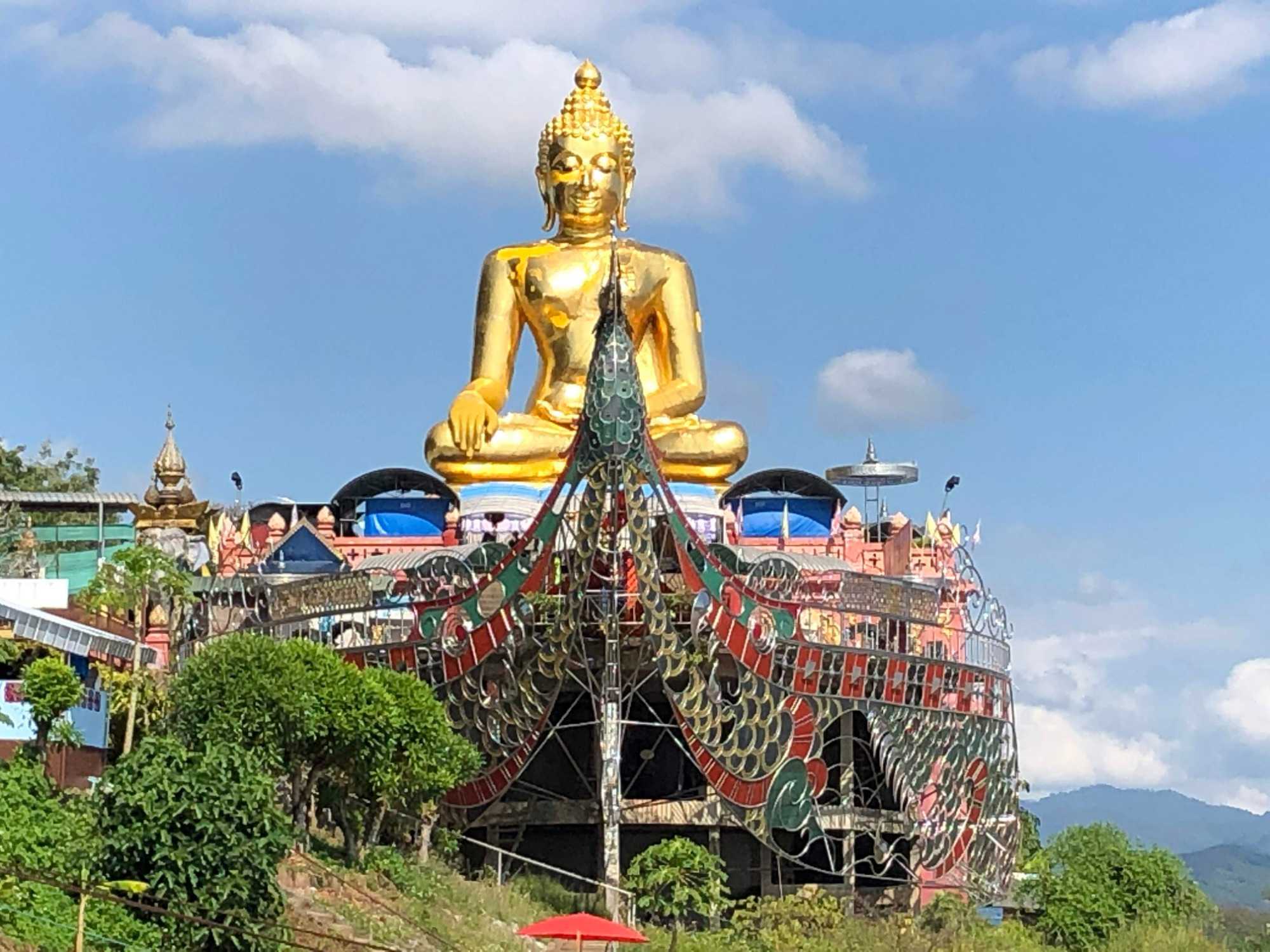 Nous partons ce matin vers le point de convergence de deux rivières et de trois nations, le fameux Triangle d’or, situé aux frontières du Myanmar, du Laos et de la Thaïlande. Le Triangle d’or était autrefois l’un des sites de la culture d’opium ainsi qu’une source importante d’héroïne au monde. De nos jours, le passé ne laisse que la belle légende et le beau paysage des rivières Ruak et Khong. Nous nous sommes dirigés tout d’abord à la frontière de la Thaïlande et du Myanmar. Une petite découverte pour voir cette frontière très occupée.