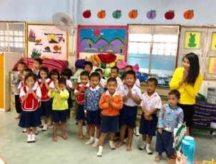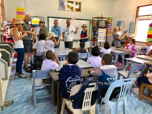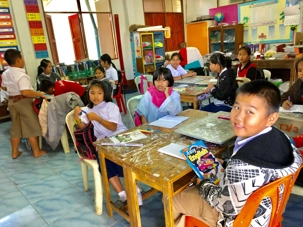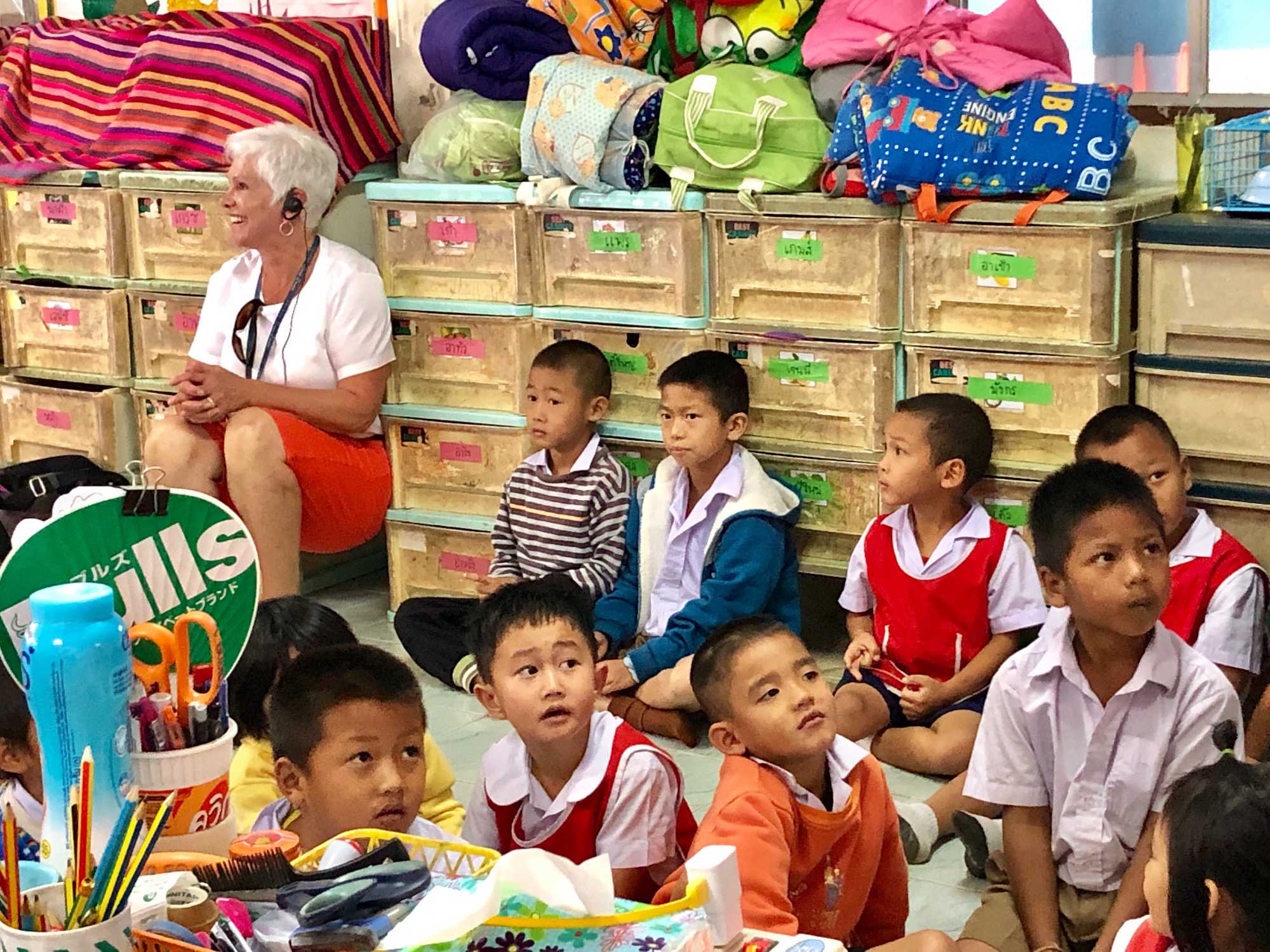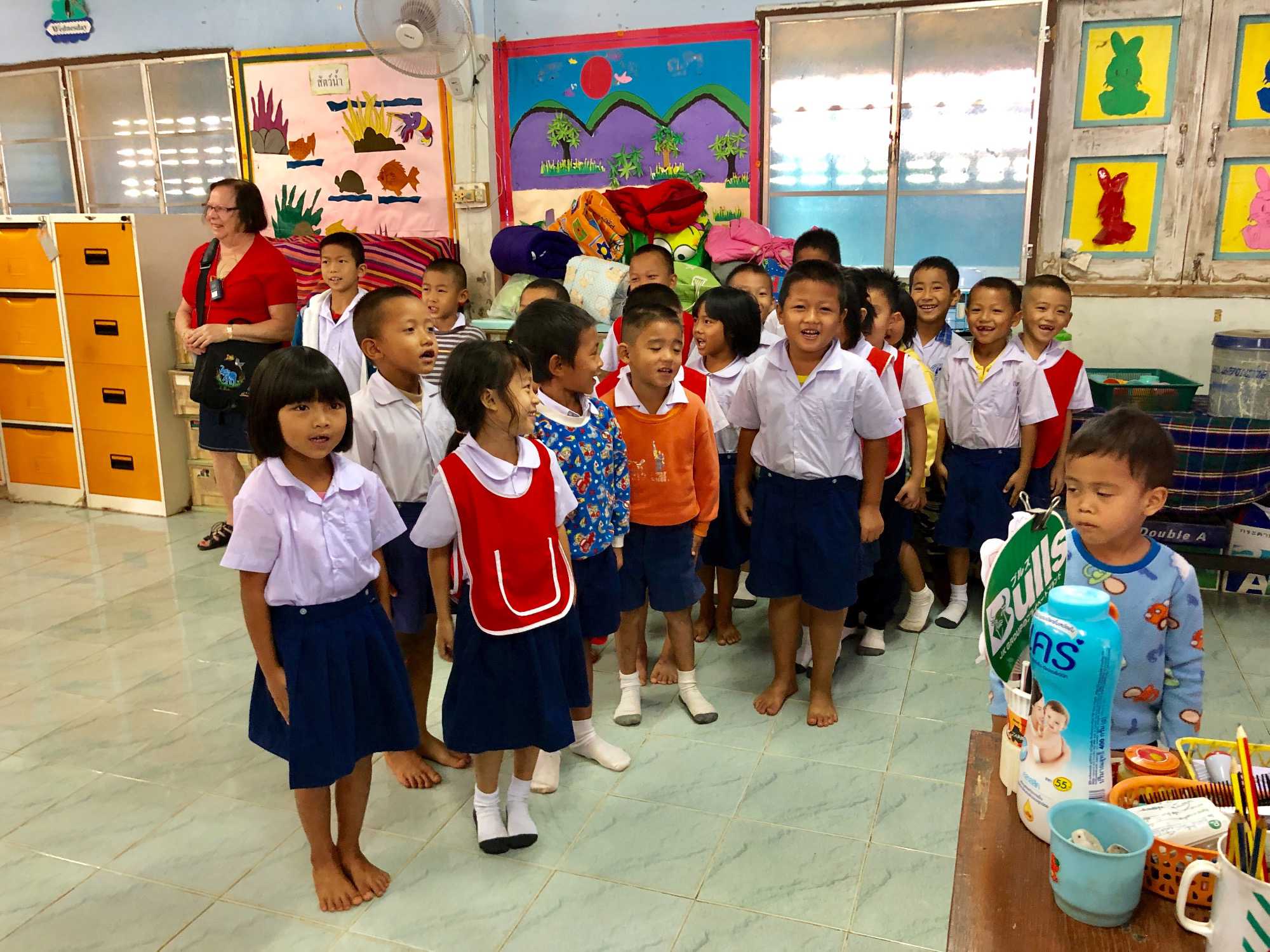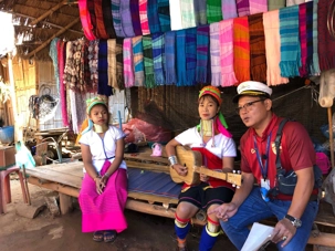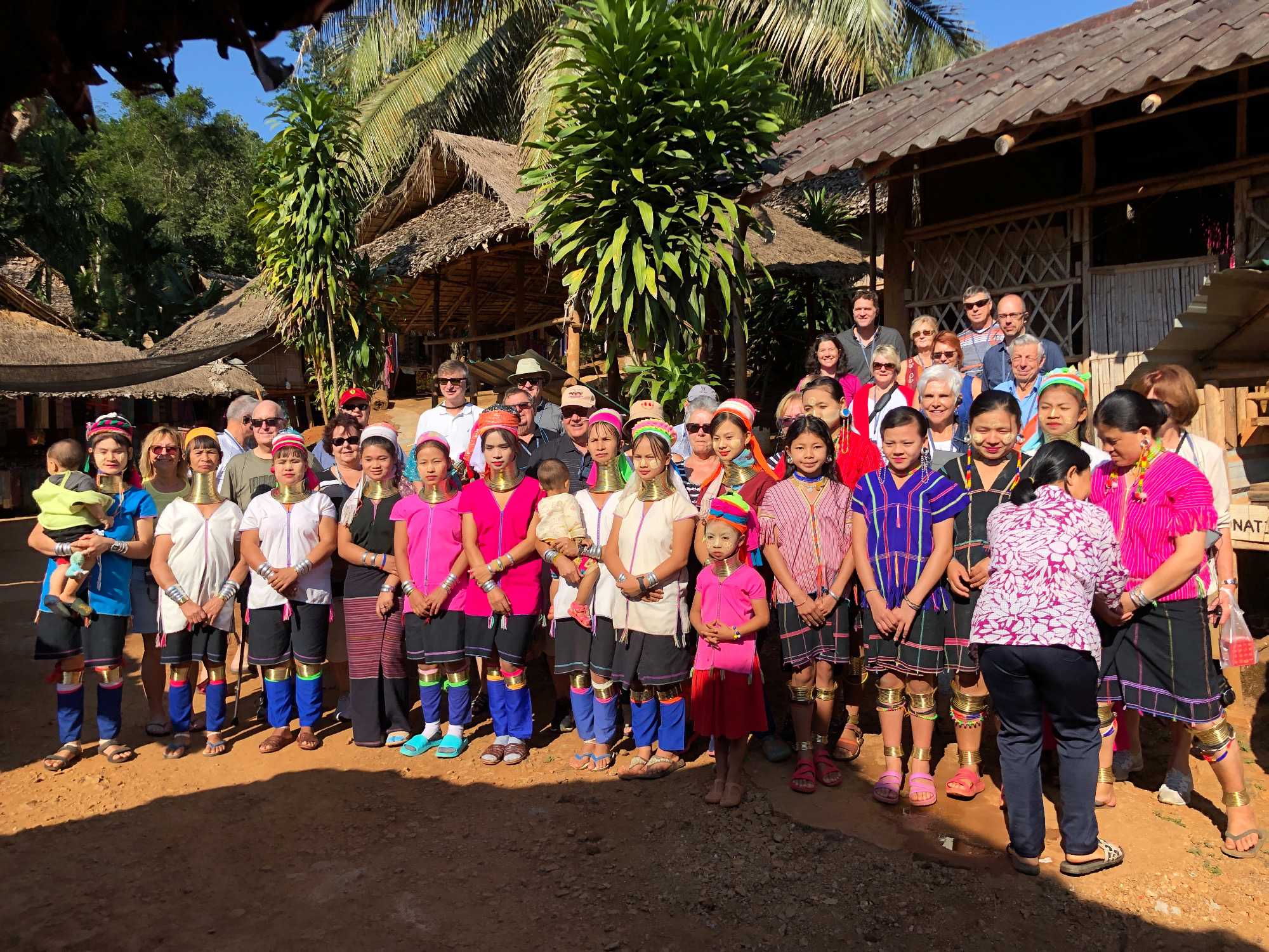 Ce fût une belle découverte dans le respect de leurs traditions et tous nos voyageurs étaient délicats et attentionnés. Ils ont tous apprécié cette belle visite. Nous avons fait une photo de groupe avec les femmes au long cou. Ensuite, nous avons fait un arrêt pour aller visiter une école primaire Plus de 5 ethnies (tribus montagnardes) partagent cette école de campagne avec des thaï plus de 100 enfants, c’est une école de la région de Mae Chan. Nous avions des petits cadeaux pour eux et les enfants ont chanté pour nous. Tellement beaux ces petits bouts de choux! Nous avons pris plein de belles photos d’enfants pour notre grand bonheur! Un beau moment de notre voyage que cet arrêt dans ce petit village