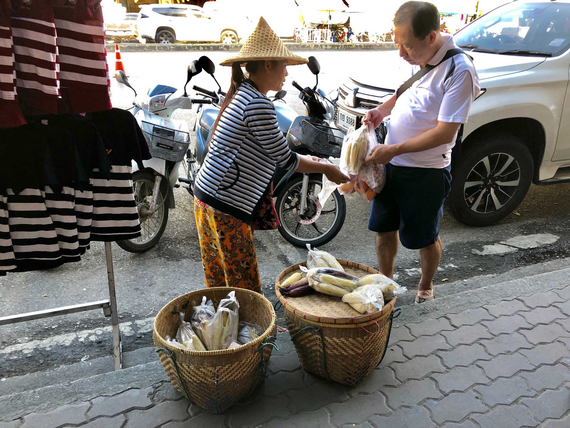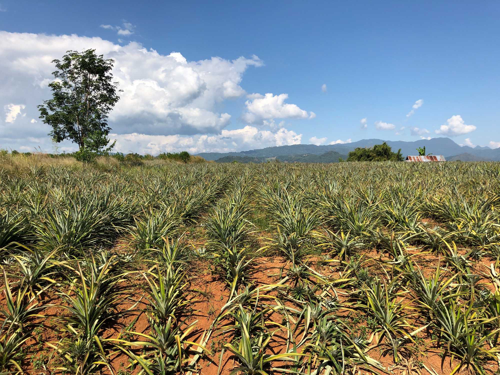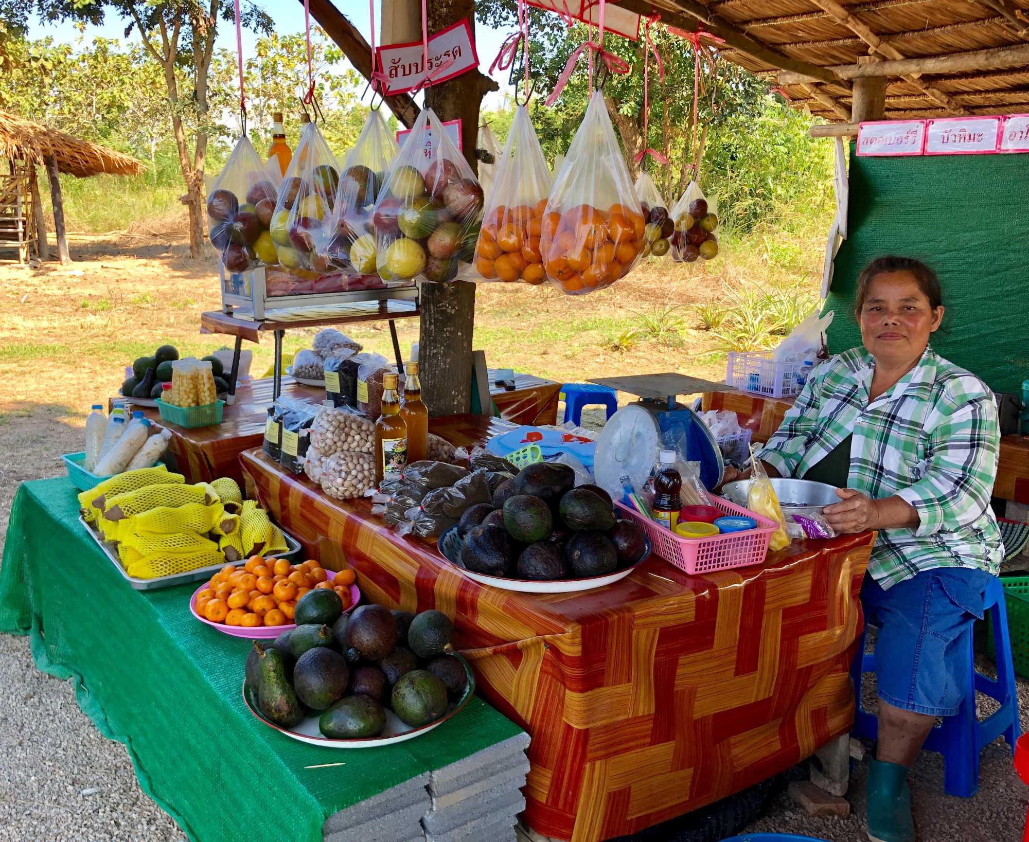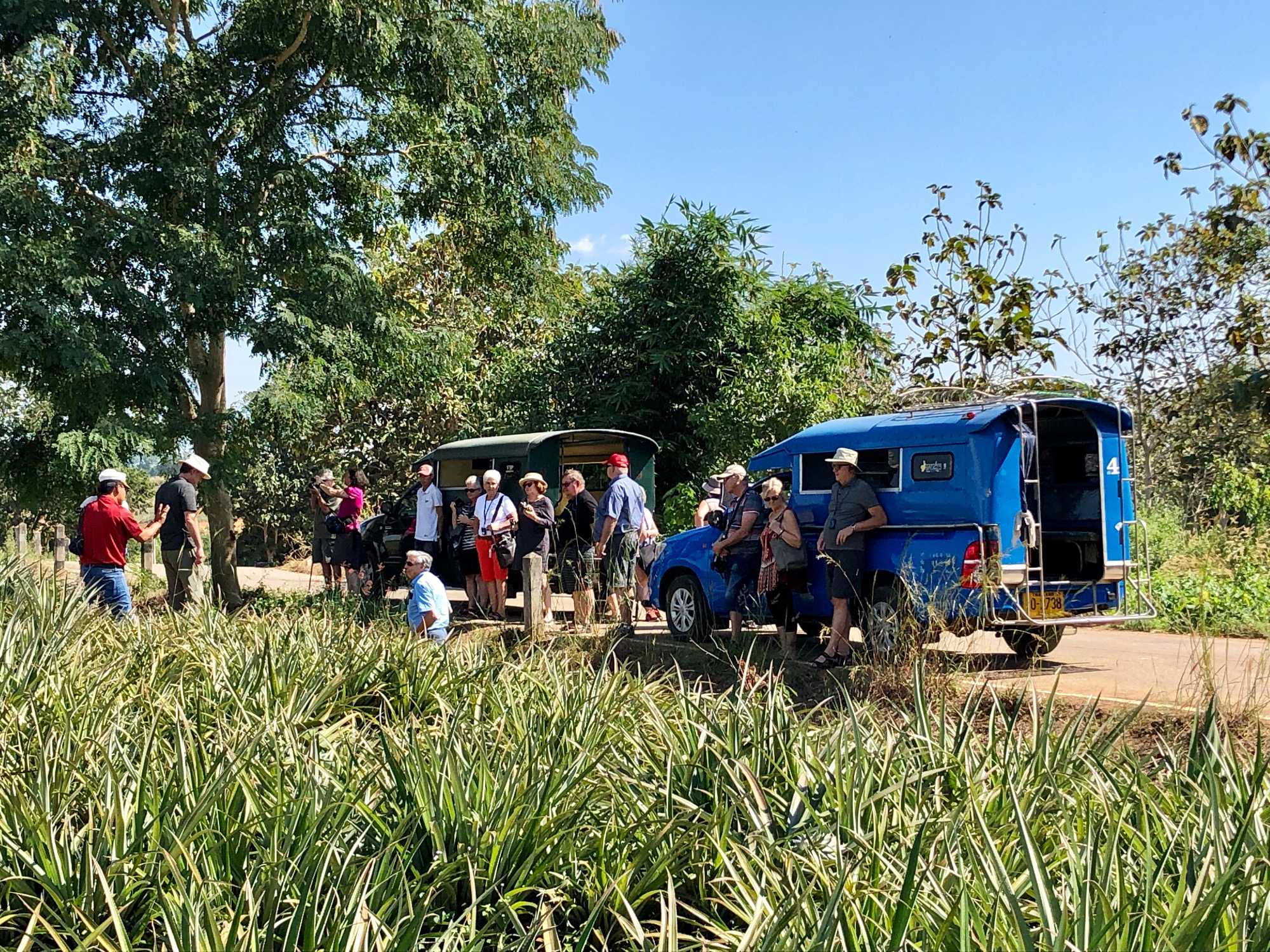 Nous nous arrêtons pour voir la plantation d’hévéas. La Thaïlande exporte beaucoup de caoutchouc et dans le pays, il y a beaucoup d’usines pour fabriquer les pneus. Pour continuer nos dégustations, on s’est arrêté à un champ d’ananas où on y cultivait une variété locale du nom de Phulare, le même que notre hôtel. C’est un ananas plus petit mais plus sucré que les autres. Tout le monde s’est régalé!