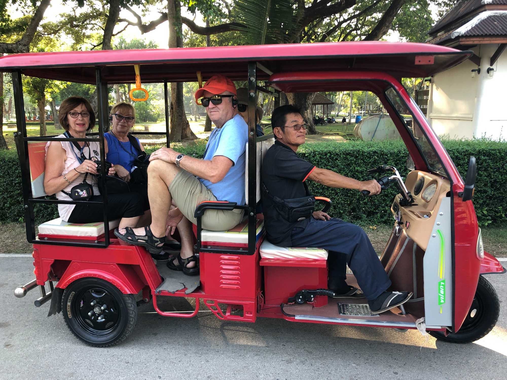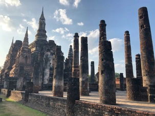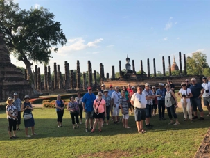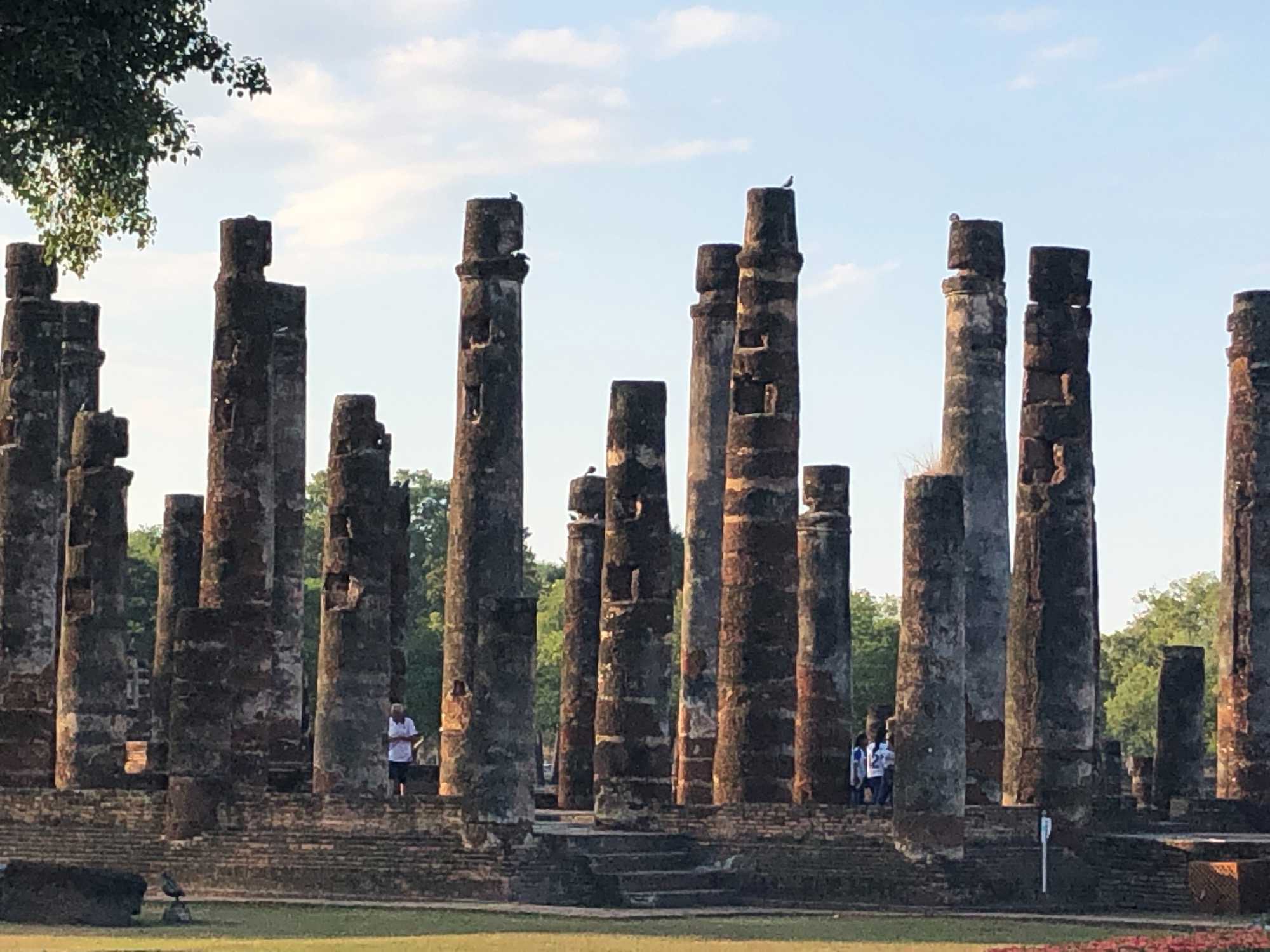 C’est aujourd’hui que commence vraiment notre découverte des vestiges de grandioses civilisations. Après notre dîner pris en route dans un restaurant de Prae, nous sommes arrivés à une petite ville aux bord de la rivière Yom, Sukhothai est fondée au 13e siècle. Ce fût la première capitale du royaume de Siam qui mettait fin au règne khmer d'Angkor Wat. Elle est plus célèbre pour son art que pour ses réalisations politiques. Nous embarquons dans un Tuk Tuk en électrique et partons à la découverte de cette ville historique. Les superbes temples et monuments de ce parc ont été restaurés soigneusement et classés au patrimoine mondial de l’héritage par l’UNESCO en 1994. À l’heure où nous avons le plaisir de visiter le site, nous retrouvons la plus belle des lumières pour faire des photos avec le soleil sur les temples de Sukhothai, c’était splendide.