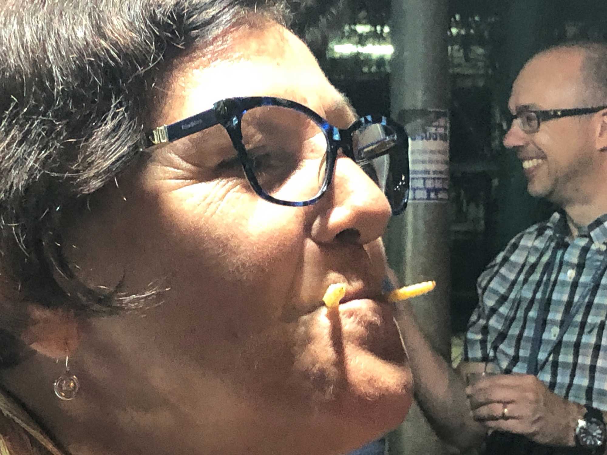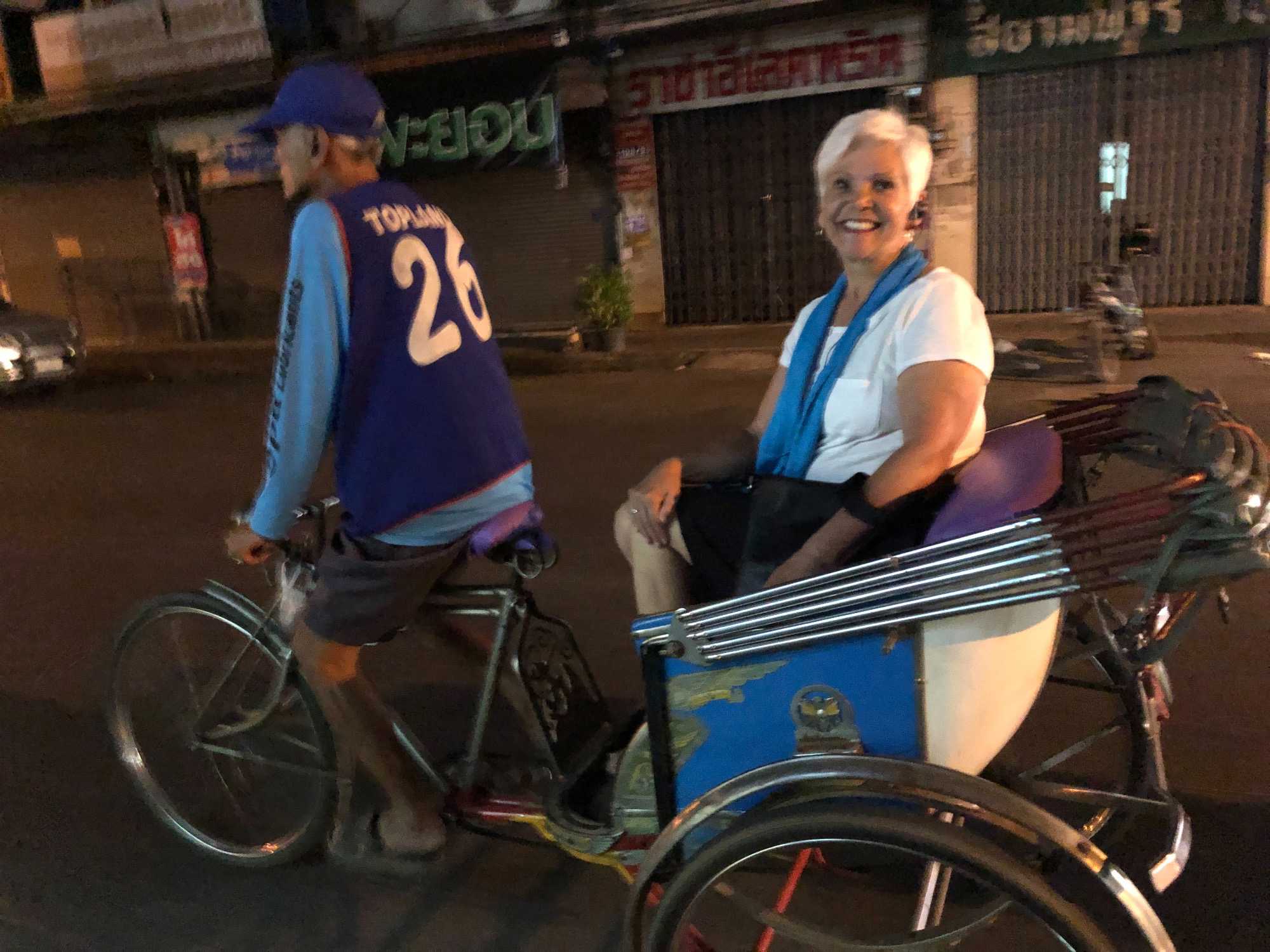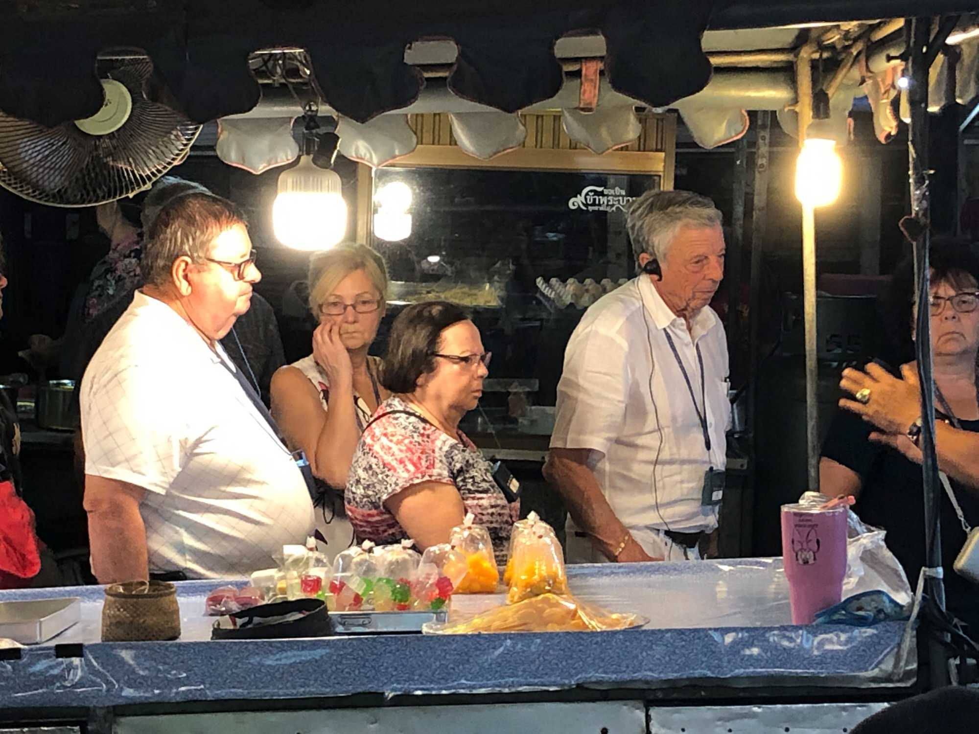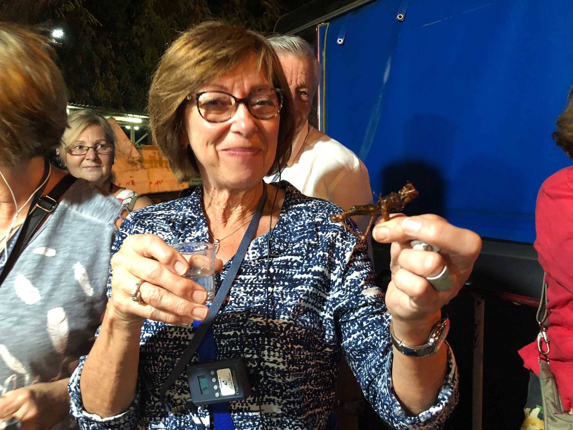 Après un excellent buffet à notre hôtel, nous avons terminé cette belle journée par une promenade en cyclo-pousse dans la ville. Quelle promenade! Imaginez nos cyclo-pousses qui se suivent dans la ville et escortés par le policier. Nous avons fait deux arrêts : un pour voir la roulotte de vente à insectes: vous savez comme nos roulottes à patates frites…mais pour y manger des vers à soie, des vers de bambou, des criquettes et de l’estomac de poulet…et bien d’autres insectes… Danielle et André ont gagné le prix pour dégustations d’insectes. Les photos vous parleront plus…