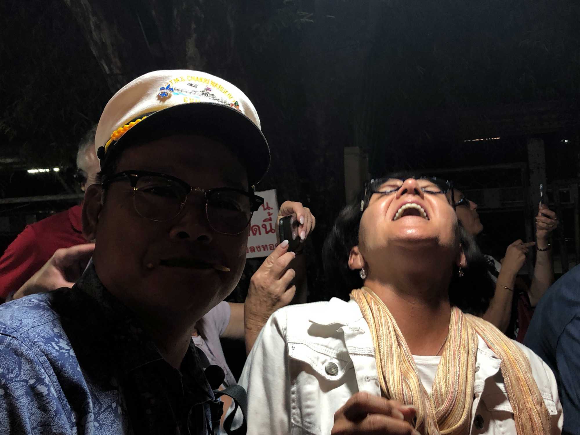 Un petite traversée dans le marché local beaucoup de fruits et des plats emporter et on reprend notre cyclo-pousse. Si on ne reconnaît pas celui qui a commencé à faire le tour pour nous, lui nous trouve. Le deuxième arrêt était pour essayer les légumes et Whisky thaï . Le restaurant «Flying vegetables» est unique en son genre et nous a bien amusés. Encore ici, les photos parleront de ces très beaux sites hauts en couleur. Le tout consiste pour le chef de cuisiner un petit peu de très bons légumes dont les liserons d’eau et d’en lancer une petite partie à quelques-uns de nous qui devaient les attraper au vol en hauteur . L'endroit est connu comme "le restaurant pour lancer des légumes volants" .