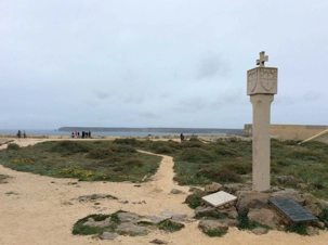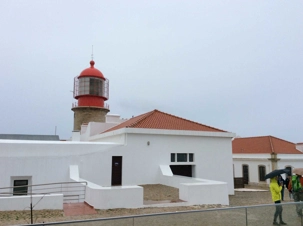 La pluie nous rejoint finalement, le temps d’une courte visite du Fort Fortaleza de Sagres. Là aussi nous sommes sur le haut d’une immense falaise au bord de la mer. Du côté de la terre, la forteresse a une imposante muraille de pierre dessinée, selon Francisco, par l’architecte militaire Vaugan. Les trois autres côtés sont protégés par les falaises abruptes donnant aucune chance à d’éventuels ennemis. Le fort est vaste, mais plutôt clairsemé : il y a une petite chapelle, une rose des vents et des vues impressionnantes sur les immenses falaises. Il accueillit l'école navale créée par Henri le Navigateur et demeure le vestige symbolisant les explorations portugaises du XVe siècle le long des côtes africaines.