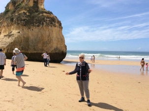 Notre hôtel est sur le haut d’une falaise facile à descendre par un ascenseur se trouvant juste à côté de la grande piscine ou en descendant un grand escalier. Tout en bas se trouve un petit bijoux de plage : « La Praia Dos Très Irmãos ». Cette plage est l’une des plus belles plages d’Algarve composée de 3 immenses rochers appelés les 3 frères. La vue y est remarquable, et c’est au pied de notre hôtel! Nous y trouvons plusieurs petites grottes à explorer. Une plage de sable de la couleur de la cassonade avec des eaux turquoises, un peu froide ce qui est normal pour la période de l’année. C’est très dépaysant, on s’imagine facilement être ailleurs dans le monde. Nous nous dirigeons vers l’Est, du côté gauche, pour rejoindre les rochers où nous entrons dans une enfilade de criques absolument magnifiques. Au pied des falaises ocres et jaunes, des petites plages de sable permettent de se baigner à l’abri du vent. Nous nous sommes contentés de mettre les pieds à l’eau bien que plusieurs enfants ne semblaient pas trouver l’eau froide! On passe de l’un à l’autre des rochers par de petites grottes ou des buttes de roches un peu escarpées. Nous avons pris des magnifiques photos. C’est à couper le souffle! Ces falaises couleur ocre contrastant avec le magnifique bleu de l’océan forment un paysage inoubliable! Nous passons sur ce site à marée basse un peu avant l’heure du midi parce que le site ne serait pas accessible à marée haute. Nous avons vérifié l’heure prévue pour la prochaine marée haute et elle est prévue pour 15h00. C’est la pleine lune, la marée sera alors à son maximum, soit plus de 3 mètres d’élévation.