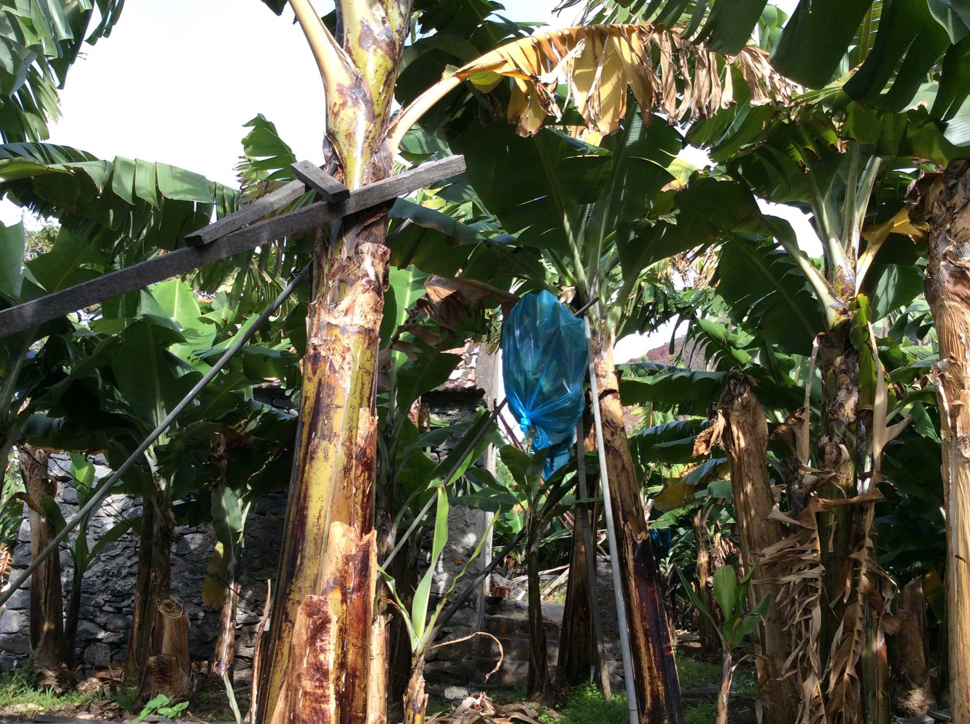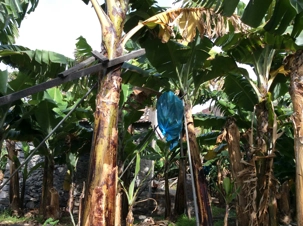 Nous prenons la direction de l’Ouest pour aller en premier vers Campanario visiter une culture de bananes. Cristina nous explique en détail comment se cultivent les bananes. Nous apprenons que chaque plan fournit un régime de bananes et met un an pour le produire avant de mourir. Chaque plan, après la récolte, doit être coupé et laisser sa place au bébé qui pousse à la base du plan mère.