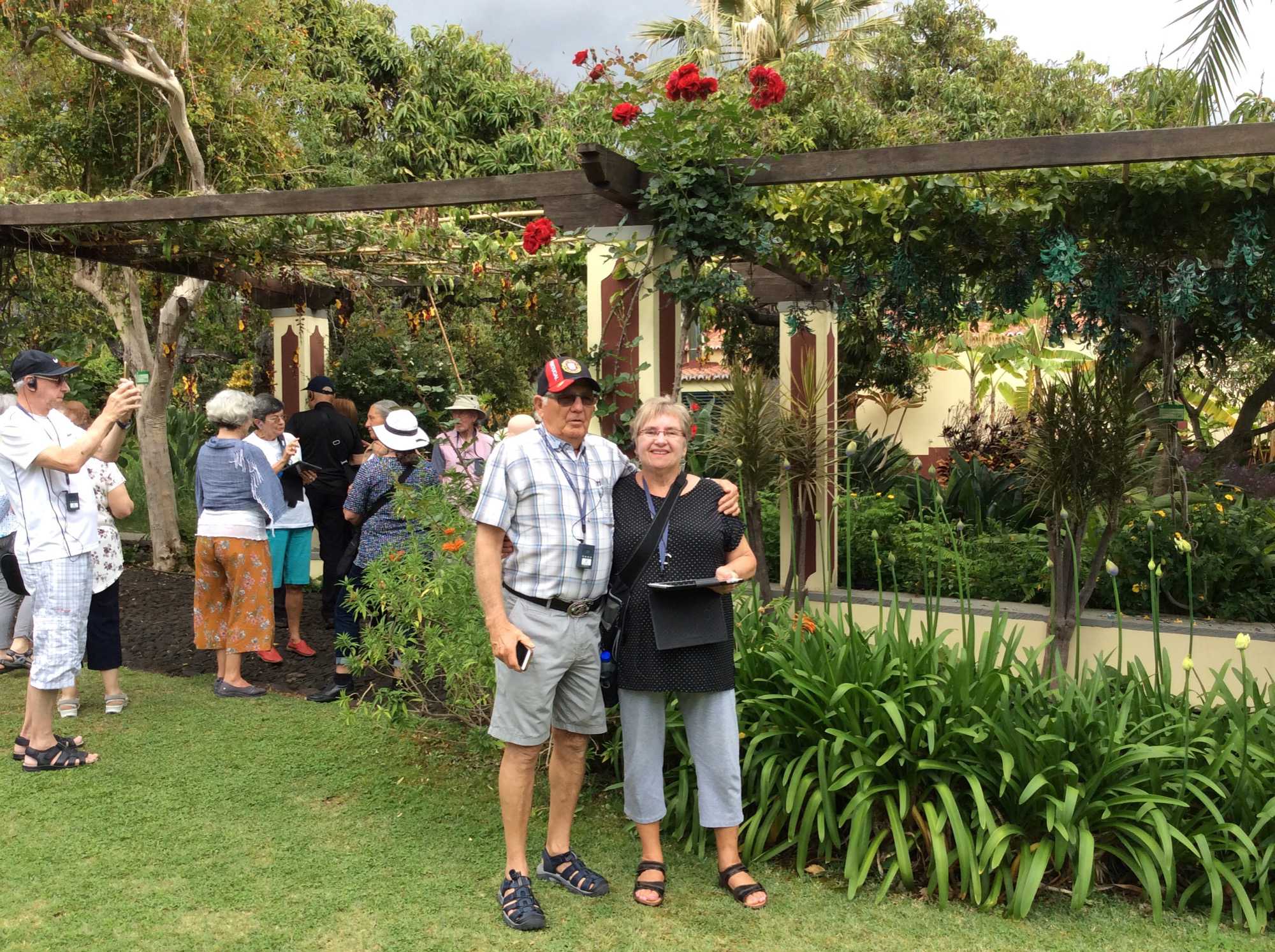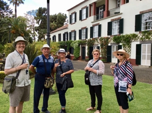 On y trouve une fantastique collection d'arbres centenaires, parmi lesquels des Dracaena draco de Madère, des Syncarpia glomelifera d'Australie, des Cinnamomum campitora de Chine ou du Japon, ainsi que de nombreuses variétés remarquables venues du monde entier, telles que des Jacaranda minosifolia d'Argentine, des Pandanus utilis de Madagascar ou encore des Erythrina abyssimica d'Afrique tropicale. Nombre des arbres de cette quinta madérienne furent plantés au début du XVIIIe siècle. Les propriétaires successifs du domaine ont su garder un contact permanent avec différents jardins botaniques dans le monde, consacrant au fil des siècles beaucoup d'amour et de temps à l'amélioration de ces jardins relaxants et colorés, qui depuis 60 ans sont la demeure de « Colombo », la tortue géante de la quinta. Avant de remonter dans l’autobus on nous invite à prendre un excellent vin de Madère dans le jardin.