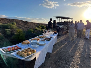 Par la suite nous étions attendus avec un petit goûter tout préparé pour nous en pleine savane. WOW! Comme nous sommes bien reçus et traités comme des riches voyageurs. Un petit cocktail en pleine savane en attendant le coucher du soleil. Cela terminait bien la journée après de super safaris.