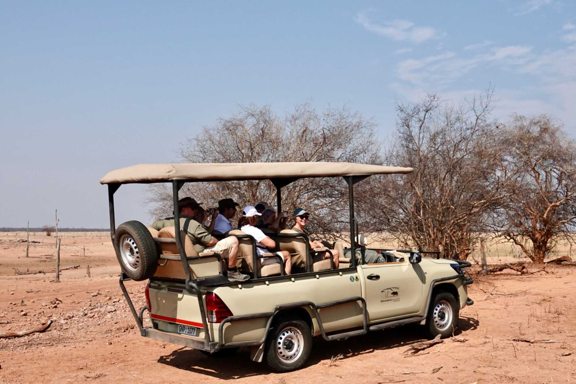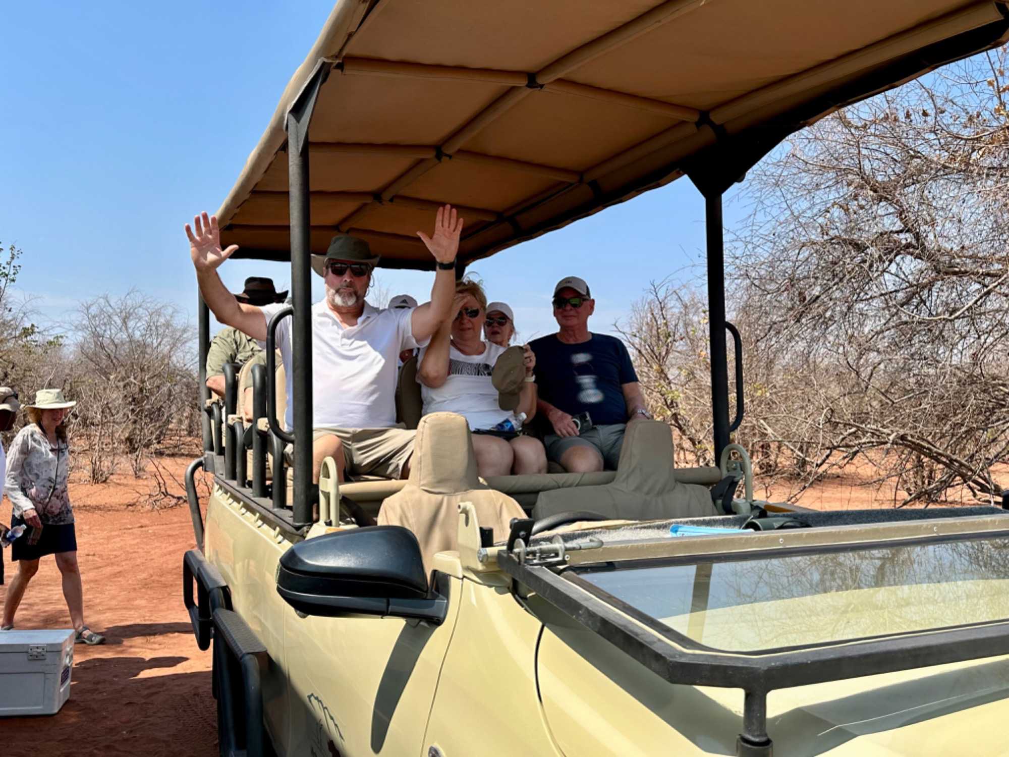 Après une bonne nuit de sommeil et un bon petit déjeuner, nous étions prêts pour notre départ. Une courte traversée en bateau et nous voilà sur la terre ferme pour découvrir le Parc de Matusadona. Au programme, une superbe matinée en safari dédiée à la découverte de la région du parc national de Matusadona situé entre les rivières Sanyati et Ume. Nos deux charmants guides zimbabwéens nous attendaient de bien bonne humeur et nous aussi. Je me répète, quel beau groupe nous avons pour ce beau voyage. D’une superficie de plus de 1 400 km², ce territoire sauvage abrite de nombreuses espèces d’animaux comme les éléphants, hippopotames, crocodiles, buffles, mais également des milliers d’oiseaux comme le mythique aigle pêcheur africain, les majestueuses cigognes à bec jaune ou encore l’aigrette noire et sa technique de pêche étonnante.