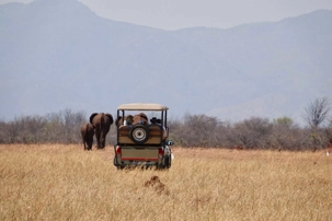 Au cœur de la savane puisque la chance était de notre côté, nous avons pu observer en partant de nombreuses antilopes, et deux Kobe qui font aussi parti de la famille des antilopes. Un peu plus loin dans ce beau décor, nous avons fait la rencontre avec un superbe mâle lion d’environ 7 à 8 ans, qui dormait paisiblement sous un arbre, à l’abri des rayons du soleil. Il nous a bien regardé et préférait ne pas trop bouger, c’était sa sieste. Nous avons photographié de très beaux zèbres et aussi des amusants babouins. Mais le plus beau des spectacles fût encore une fois les superbes groupes d’éléphants qui nous ont charmés. C’est si beau de les voir se baigner et se promener dans le parc.
