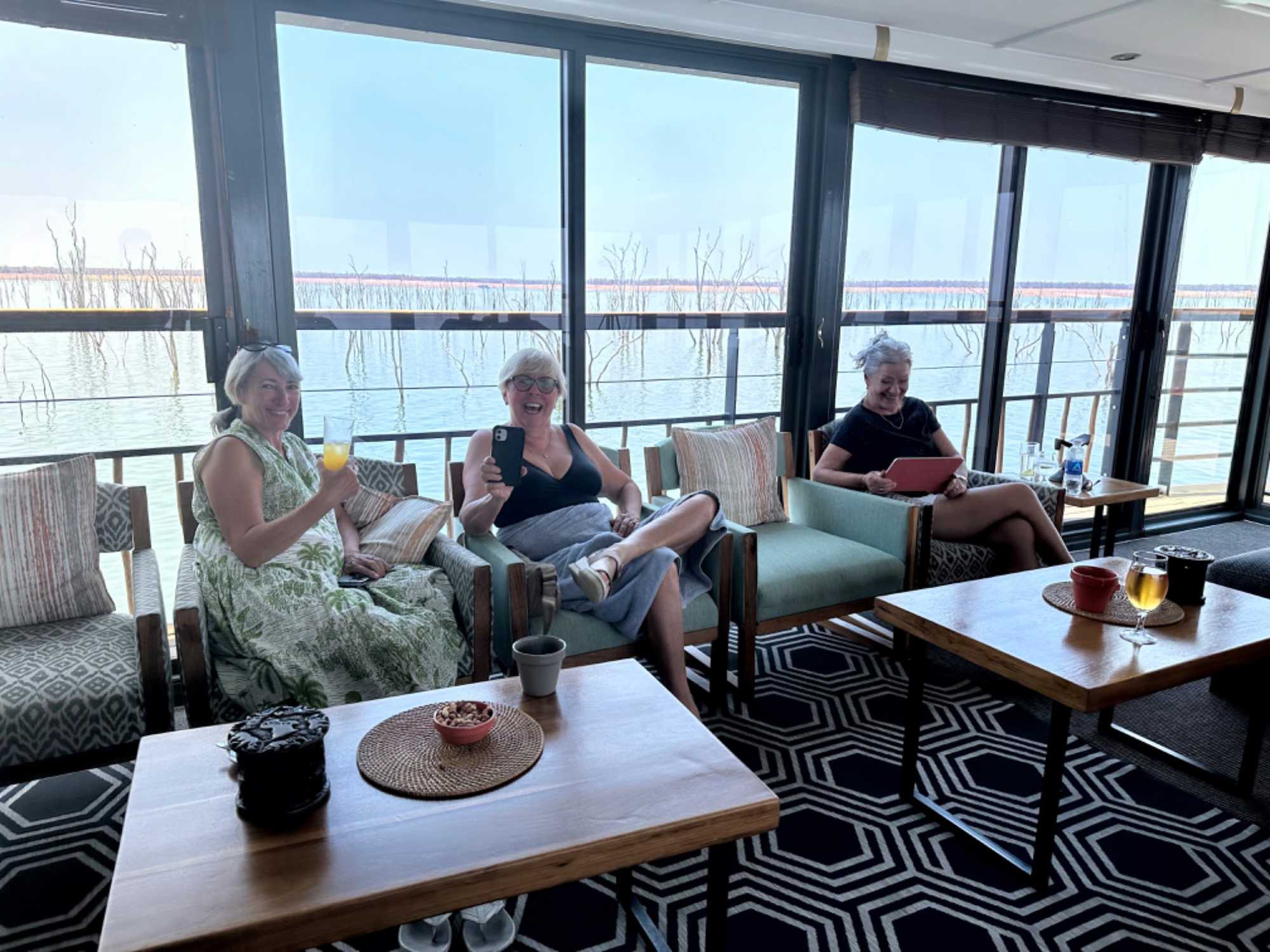 Nous avons pris notre diner à bord pour ensuite reprendre la navigation. Les voyageurs étaient invités à participer à la table ronde sur le thème de l’histoire du lac, de ses habitants et de son écosystème. Nous étions tous présents pour discuter et visionner un film intéressant sur l’histoire du lac Kariba et l’acheminement de notre navire pour naviguer sur le lac. L’apéro entre amis c’est toujours un beau moment de notre journée et nous étions attendus pour faire un safari nautique mais lors de la traversée du lac, le vent s’est levé et par précaution nous avons préféré revenir à notre navire. L’apéro a été juste un peu plus tôt et comme la communication n’est pas trop mal sur le navire plusieurs ont utilisé leur cellulaire. Mais pour moi charger les photos ce n’est pas super donc tout va s’ajouter prochainement.