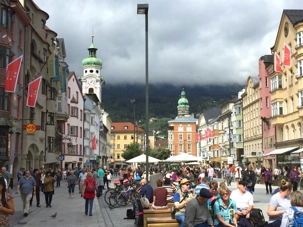 C’est à pied et avec l’aide d’un guide qui nous accompagne, que nous découvrons Innsbruck. Nous sommes tous rapidement envoûtés, par cette vieille ville : Vivante et animée, avec un paysage quasi indescriptible et tout autour, d’impressionnantes montagnes abruptes. Un contraste saisissant, une atmosphère à la fois intime et grandiose. Innsbruck compte de majestueux édifices historiques, de somptueux monuments, de nombreuses boutiques, de multiples restaurants-terrasses et de superbes parcs. Presque la totalité de ce que nous voyons, est digne d’intérêt : le palais Impérial, l’église impériale, la Maria Theresien Strasse, la Herzog-Friedrich Strasse, le célèbre petit toit d’or et bien plus. Tant de choses à voir et à admirer !