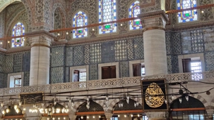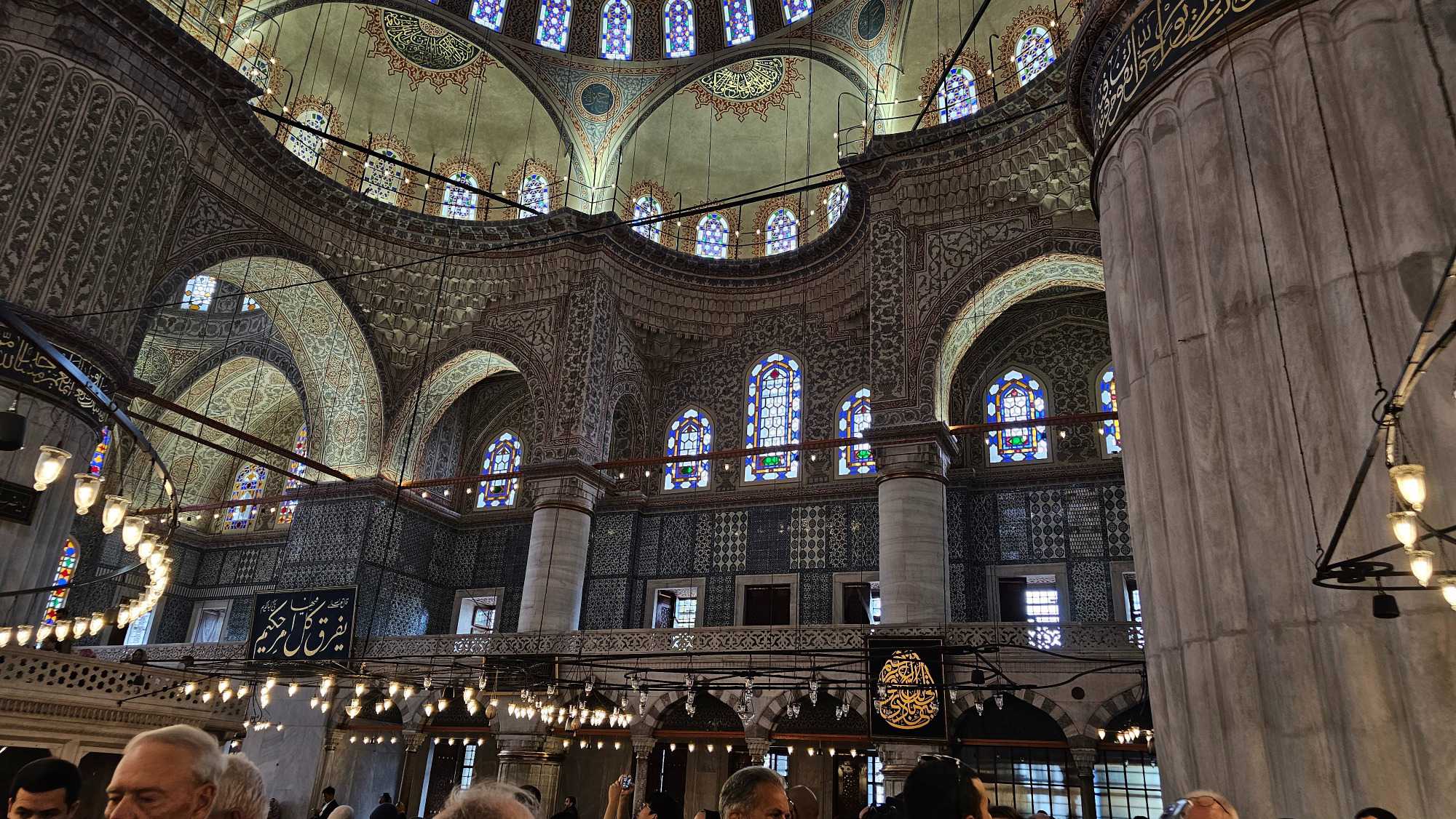 l'intérieur est impressionnant avec ses 21 403 faïences bleues (tuiles), son dôme central, ses200 vitraux et ses lustres suspendus plafond.