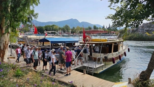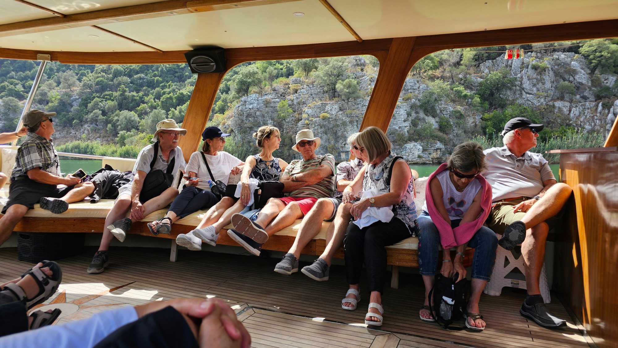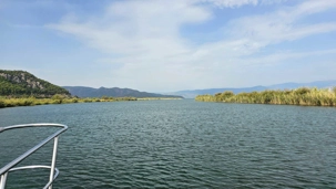 On arrive à Dalyan, petit village au bord du détroit du même nom qui prend naissance à la mer et se dirige vers un lac. Ici, tous les déplacements se font à bateaux sur la rivière. Ca explique pourquoi on en voie partout sur les rives. Dalyan signifie « barrage de pêche » en turc. Le bar, le mulet et la dorade remontent le détroit de la mer jusqu'au lac Köyceğiz. Les poissons y frayent et, lorsqu'ils retournent à la mer, ils sont prisonniers du détroit car un barrage en grillage qui les empêche de retourner à la mer. On est passé par là en bateau. Il y a une porte par laquelle circulent les bateaux qui peut être fermée.