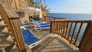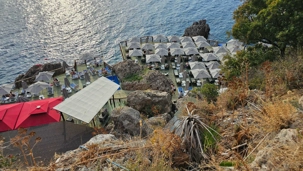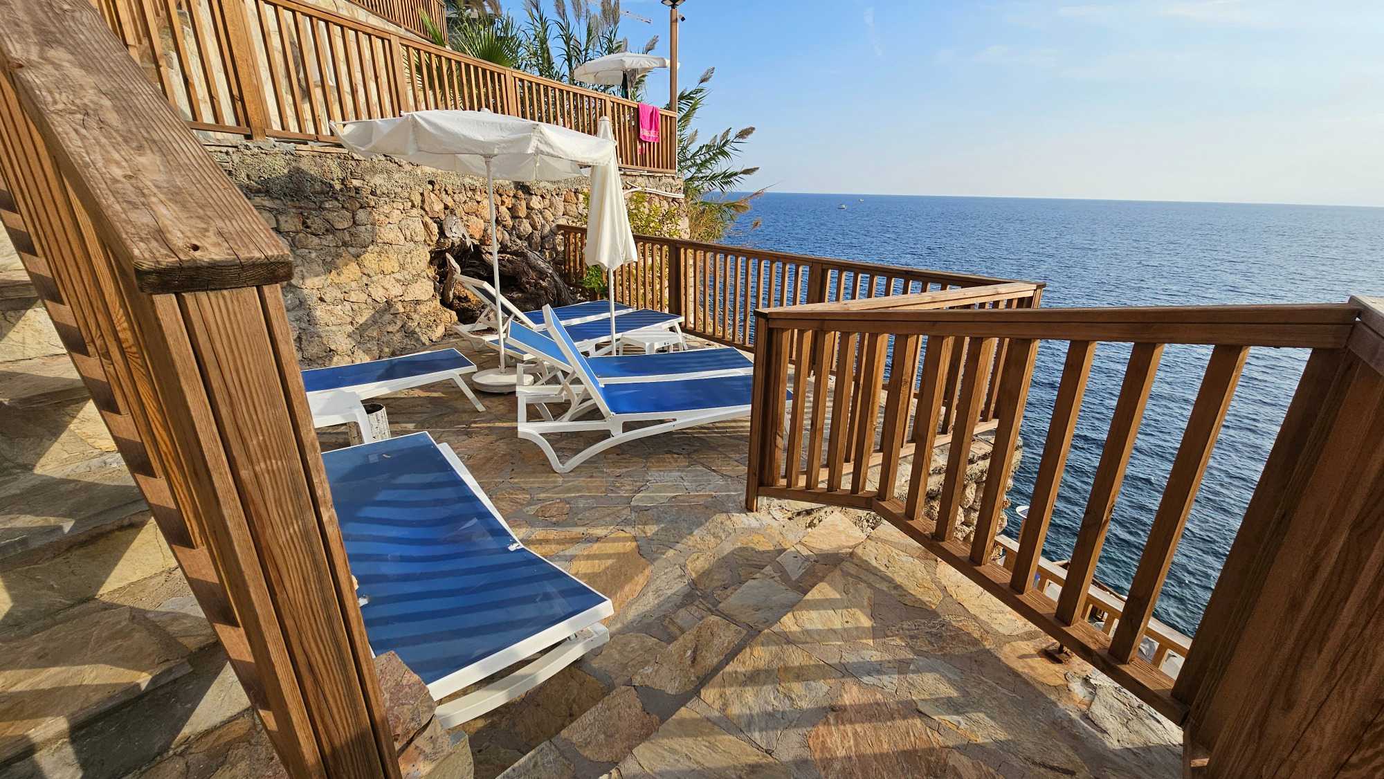 Notre hôtel est à flanc de montagne, donc pas de plage, mais une plateforme pour les chaises longues et une descente à la mer. C’est quand même agréable d’entendre le clapotis des vagues sur les rochers. On peut aussi profiter de la piscine, quelques étages d’escalier plus haut…