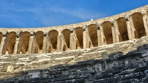 Dans l' antiquité, une partie de la région de l' Anatolie était la « Pamphile », là où on se trouve. Créée par la migration des peuples de l’Anatolie, plusieurs villes ont ainsi été créées mais la plus impressionnante a été Aspendos. Elle est devenue riche par l'agriculture mais aussi le commerce, puisque bien située près d’une rivière avec un grand trafic maritime permettant l'exportation. Il ne reste maintenant que l’acropole qui surplombait la ville. Aspendos a été le théâtre de plusieurs conflits et a souvent changé de régnant. Ici également un tremblement de terre a contribué à la destruction de la ville. Le théâtre a été restauré au début de l’ère de la Turquie moderne et est encore utilisé pour la présentation de spectacles de folklore, musique que ce soit des opéras ou concerts.