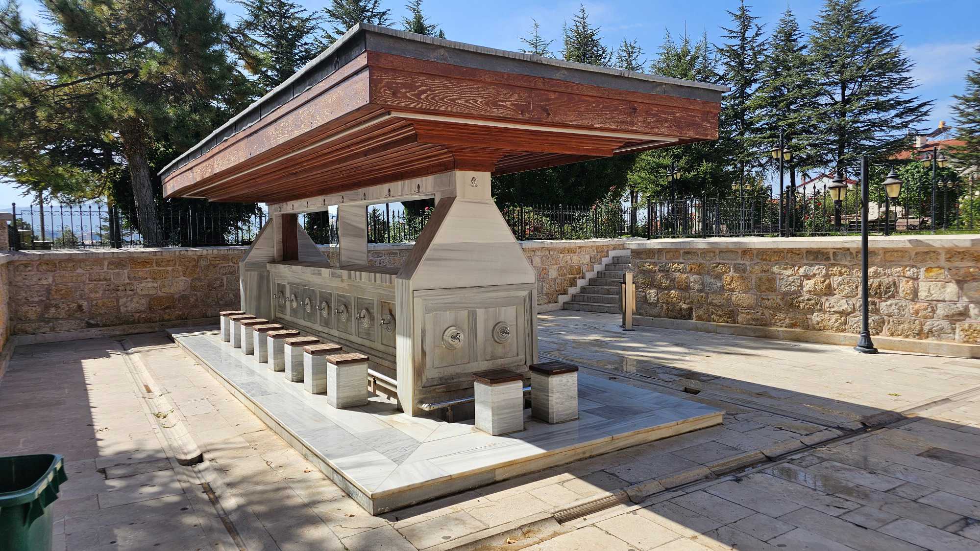 Sur le plateau anatolien, à environ 1200m d’altitude, on passe par le village de Buyehir. C' est un des villages les plus en altitude de la région. Il y a effectivement une petite fraîcheur en sortant du bus pour visiter la mosquée Esrefoglu. Elle a été construite entre 1206 et 1299 par le peuple du même nom. C' est une mosquée avec une influence plus asiatique, un peu différente dans sa conception entre autre avec des minarets plus épais et sa structure en bois de cèdre à l’intérieur. La structure avec ses détails est impressionnante. Le travail du bois, les colonnes de cèdre, le puit central sous une ouverture au centre du toit servant à y ramasser l’eau de pluie, gardant la pièce humide, évitant ainsi le fendillement du bois. Ingénieux