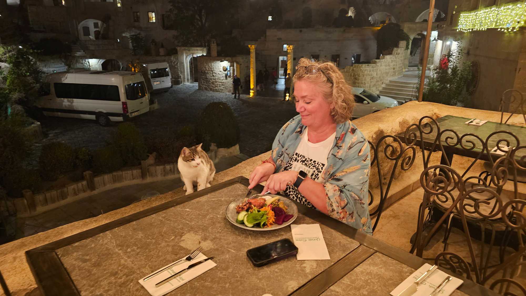 On a peu de temps pour explorer, on veut souper aller tôt car demain le départ est prévu à 5h15! Oh joie, les chats sont du souper. Bernard prends exemple sur les Turques et laisse sa place au chat qui a pris possession de sa chaise…. Une fois repu, les chats reprennent leur dominance sur les humains.. :)
