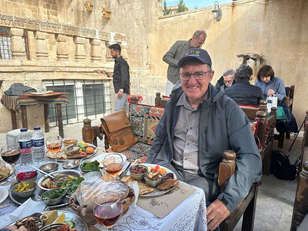 On doit quitter notre autobus car il est trop gros pour naviguer dans cette ville aux rues étroites. Un plus petit autobus nous amène a notre restaurant pour diner. Yavuz se surpasse encore pour nous dénicher une belle petite place avec vue sur la Mésopotamie, à partir de la terrasse en haut du restaurant. Encore ce midi on a droit à un repas typique de la place. Même le vin était local, mais il fait l’unanimité, il n’est pas très bon…. Il goûte la cannelle. Qu’à cela ne tienne, l’expérience outrepasse de loin ce détail.