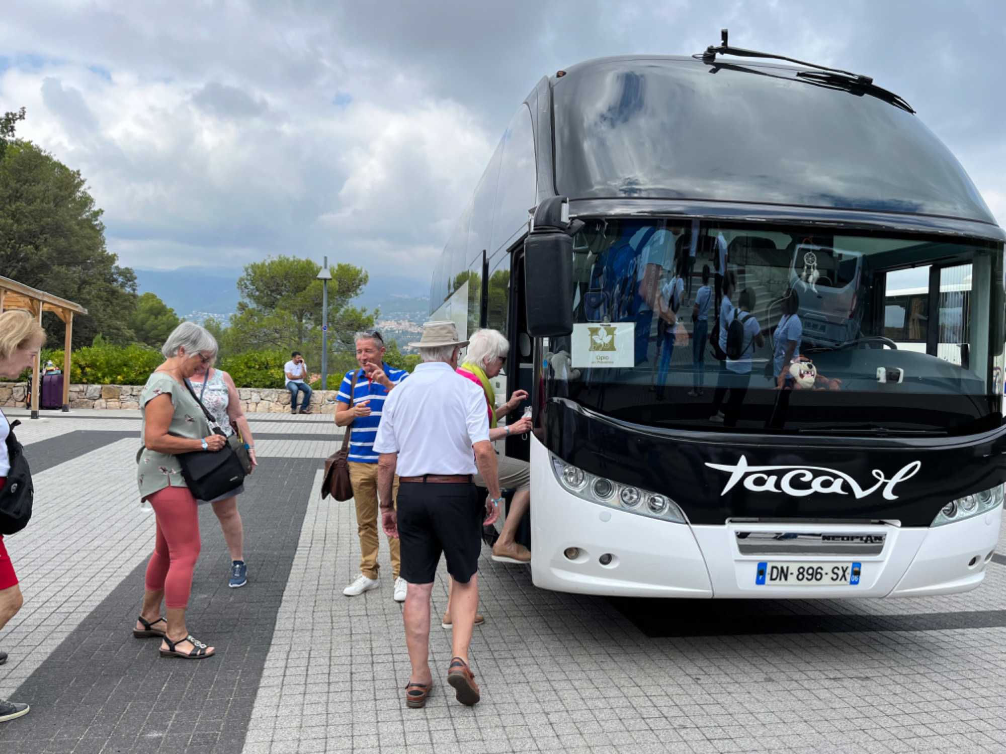 Nous prenons le petit train touristique pour visiter la ville sans se fatiguer. Notre tour débute face à l’hôtel Splendid. Nous longeons le boulevard de la Croisette vers l’Est puis vers l’Ouest. La Croisette, quartier le plus connu de la ville, abrite de nombreux palaces alignés le long du célèbre boulevard. Bordé de palmiers, de palaces de luxe, de boutiques et de bâtiments de très haut standing. Nous avons déjà aperçu une partie de ce secteur à la télévision, lors du célèbre festival de Cannes qui se tient chaque année. L’architecture des lieux et la qualité des constructions en font une véritable perle. On passe devant le port de Pierre Canto, où flottent de luxueux yachts appartenant souvent à des personnalités publiques célèbres. Notre train nous amène jusqu’en haut de la Coline de Cannes. On y trouve les restes d’une ancienne muraille et une vieille église. Nous apprécions le point de vue sur toute la ville et les appareils photos des voyageurs sont très occupés tellement la vue est formidable. Au retour nous passons dans les petites allées fleuries de la Liberté. C’est dans ce quartier qu’est situé l’Hôtel de Ville. Enfin, le secteur, très riche en commerces de tous genres, est idéal pour y faire un peu de magasinage.
