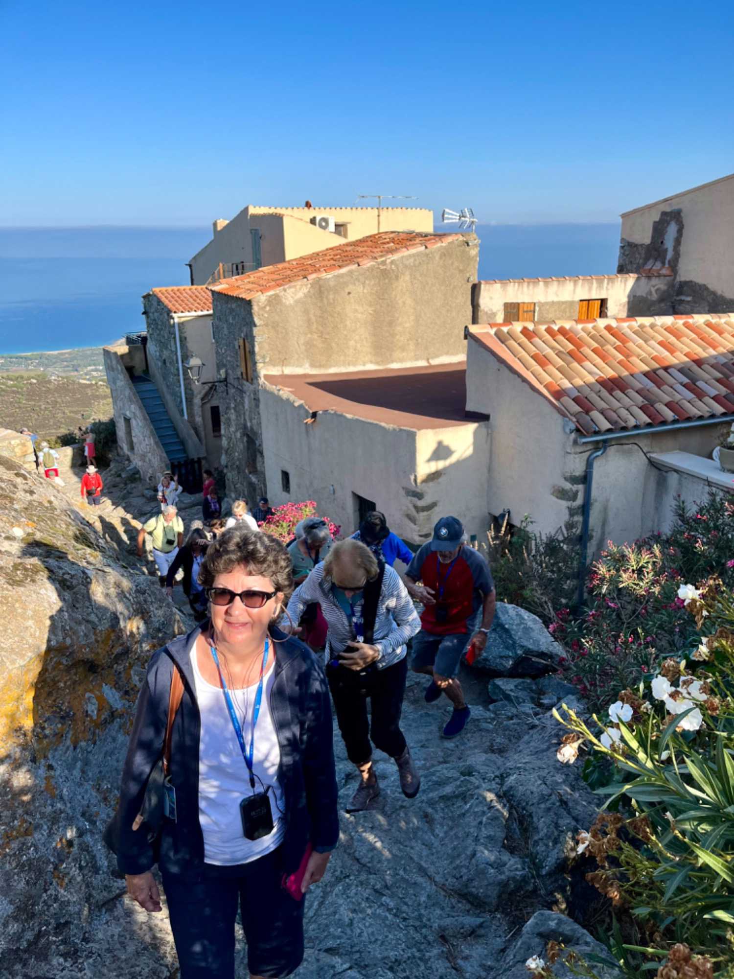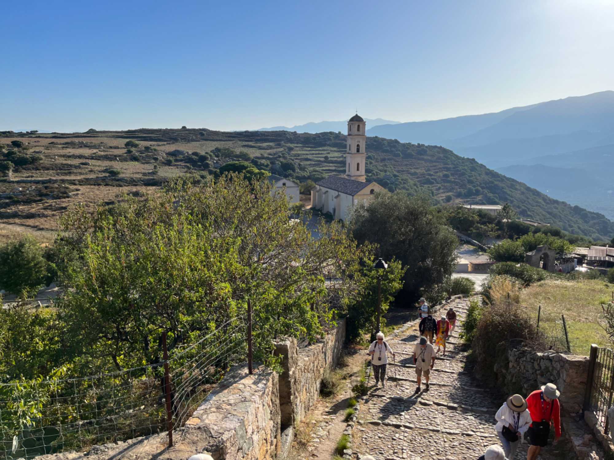 Nous visitons San Antonino, village médiéval qui culmine à 500m d’altitude et figure parmi les plus anciens de Haute-Corse. En raison de sa hauteur et de son emplacement, San Antonino est le seul village que l’on voit presque toujours où que l’on se trouve en Balagne. On y trouve 75 maisons construites à même la roche avec la pierre du pays. Soudées les unes aux autres, ces demeures s’enroulent autour du piton granitique pour ainsi former un embryon de labyrinthe. Au sommet du village, se trouvent notamment les vestiges d’anciennes fortifications. Là, on prend bien notre respiration et maintenant, on ouvre grands les yeux pour découvrir, depuis ce roc, toute la Balagne! Imaginez autrefois ces vallées plantées d’oliviers, de vignes, d’amandiers avec, à l’horizon, la mer qui scintille... Nous sommes en plein coeur de ce que l’on appelait jadis, le jardin de la Corse!