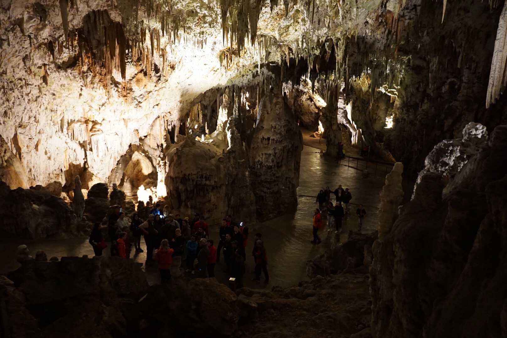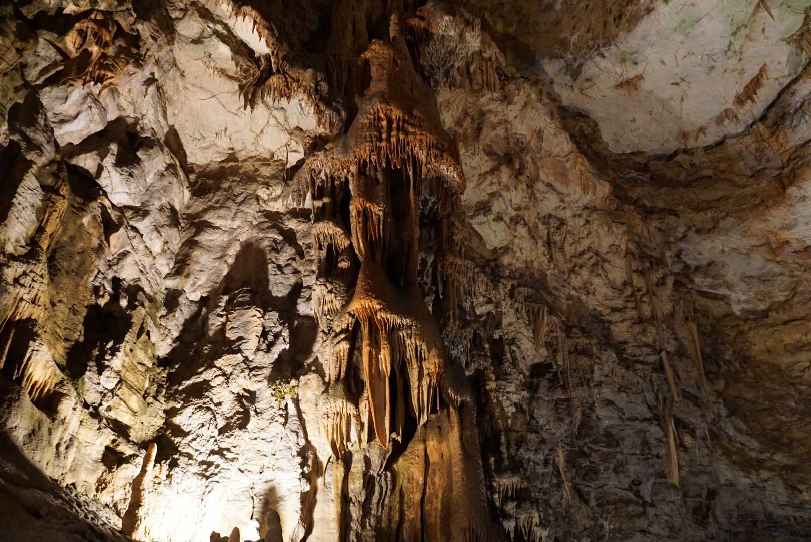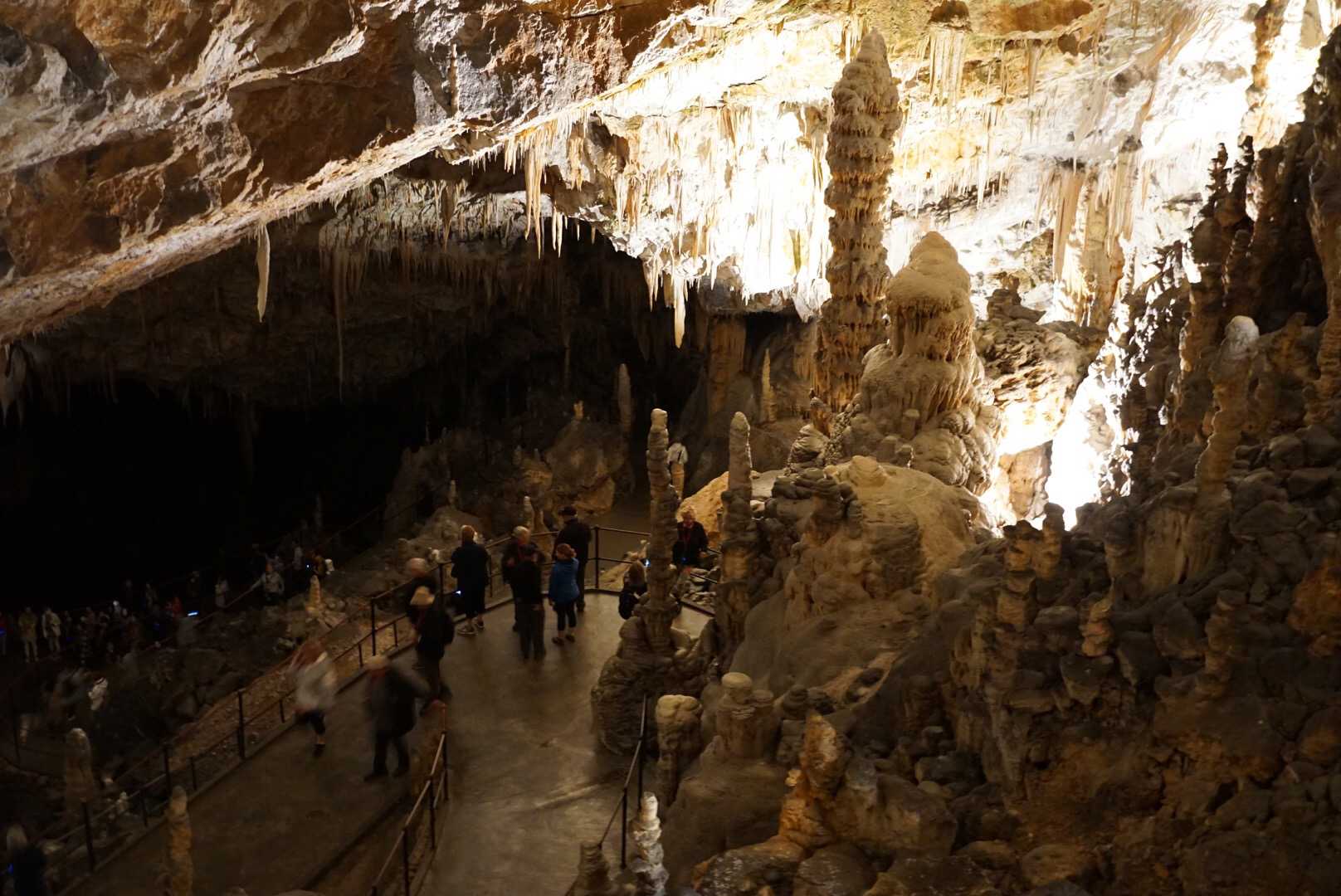 Nous avons le plaisir de visiter la grotte de Postojnska Jama, grotte célèbre qui accueille plusieurs milliers de touristes chaque année. C’est en petit train que nous nous dirigeons dans le cœur de la grotte. La balade est vraiment spectaculaire et le petit train inauguré en 1872 roule assez rapidement dans les corridors aménagés pour nous faire descendre à plus de 130 mètres de profondeur. Le petit train souterrain nous a amenés dans la grotte sur une voie de 3,7 km de long, il s'agit du seul chemin de fer au monde à double voie dans une grotte. L'ambiance féérique le long du chemin est renforcée par les magnifiques lustres en verre de Murano qui ornent le plafond de la salle de Concert. C’est vraiment de toute beauté et ce n’est que le début. Il fait 11 degrés à l’intérieur et l’humidité y est naturellement fort présente. Des kilomètres de stalagmites et de stalactites, formés depuis des millions d’années nous entourent. Un des plus impressionnant fût la stalagmite de cinq mètres de haut de couleur blanche brillante, qui s'appelle le Brillant. Dans toute sa majesté il est le symbole de la grotte de Postojna et du karst slovène.