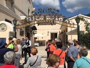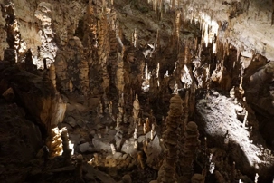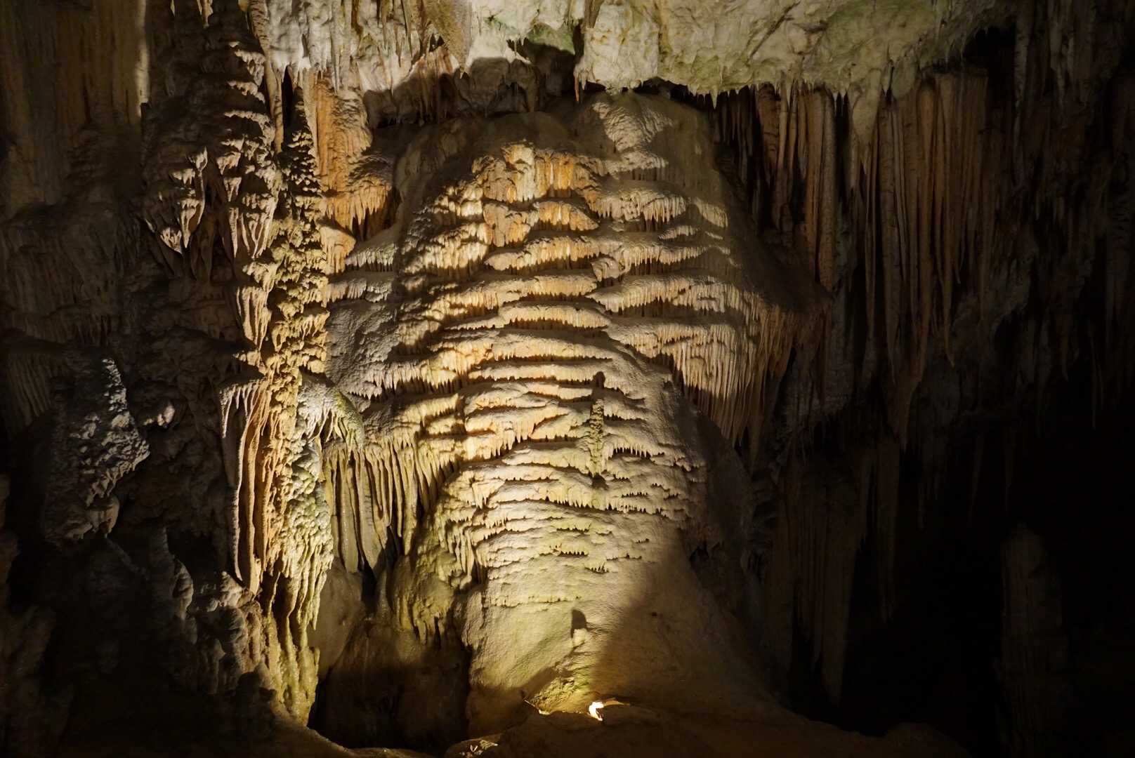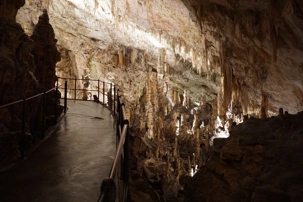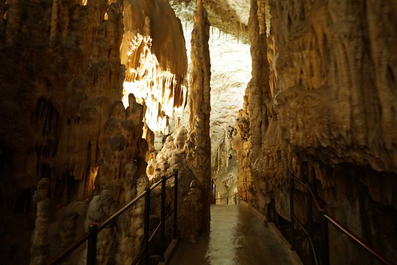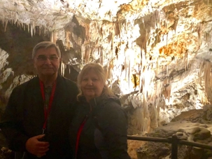 Nous avons le plaisir de visiter la grotte de Postojnska Jama, grotte célèbre qui accueille plusieurs milliers de touristes chaque année. C’est en petit train que nous nous dirigeons dans le cœur de la grotte. La balade est vraiment spectaculaire et le petit train inauguré en 1872 roule assez rapidement dans les corridors aménagés pour nous faire descendre à plus de 130 mètres de profondeur. Le petit train souterrain nous a amenés dans la grotte sur une voie de 3,7 km de long, il s'agit du seul chemin de fer au monde à double voie dans une grotte. L'ambiance féérique le long du chemin est renforcée par les magnifiques lustres en verre de Murano qui ornent le plafond de la salle de Concert. C’est vraiment de toute beauté et ce n’est que le début. Il fait 11 degrés à l’intérieur et l’humidité y est naturellement fort présente. Des kilomètres de stalagmites et de stalactites, formés depuis des millions d’années nous entourent. Un des plus impressionnant fût la stalagmite de cinq mètres de haut de couleur blanche brillante, qui s'appelle le Brillant. Dans toute sa majesté il est le symbole de la grotte de Postojna et du karst slovène.