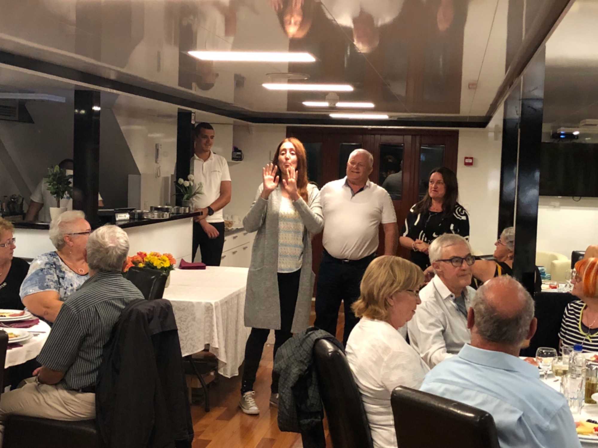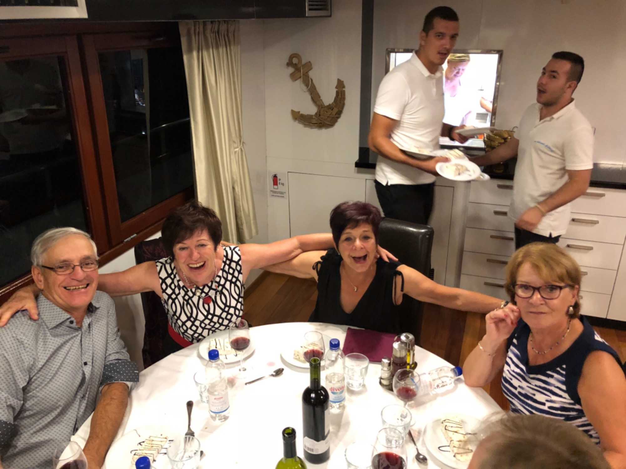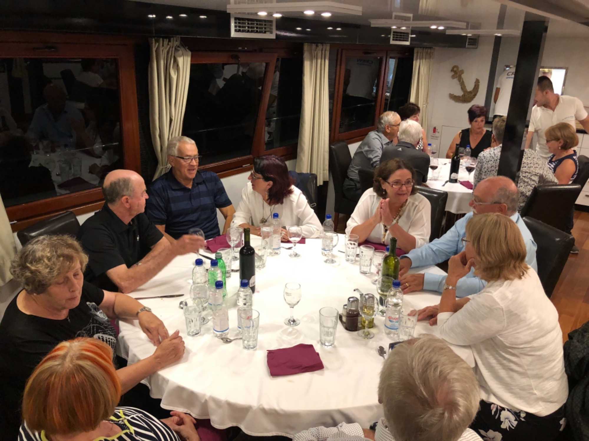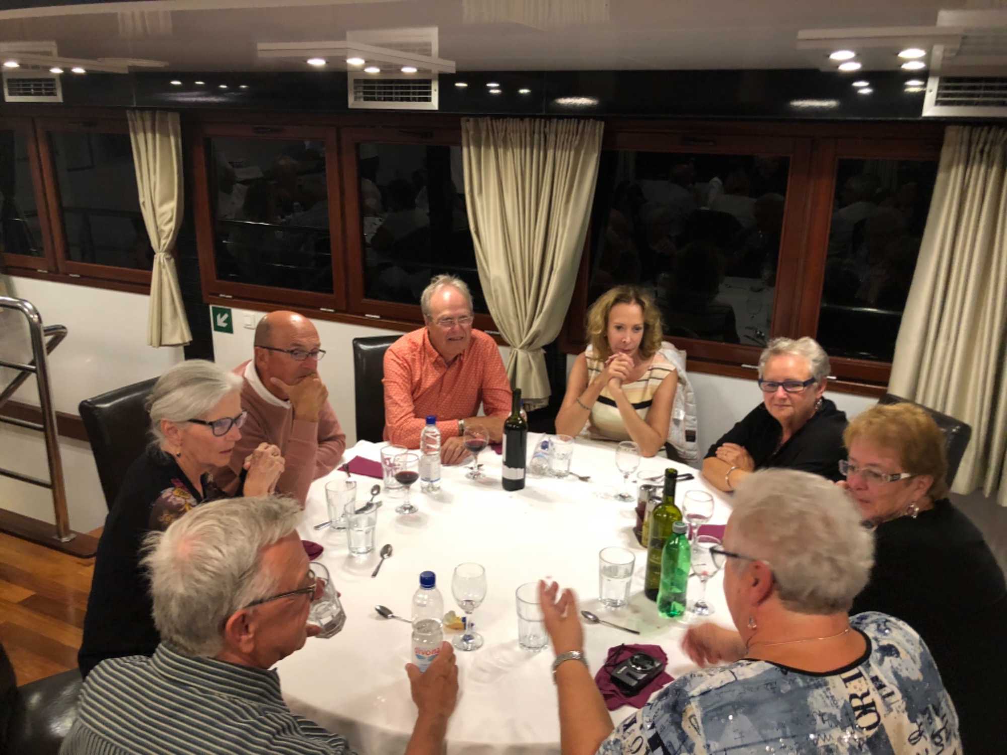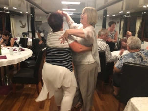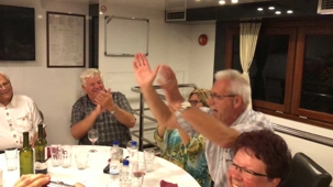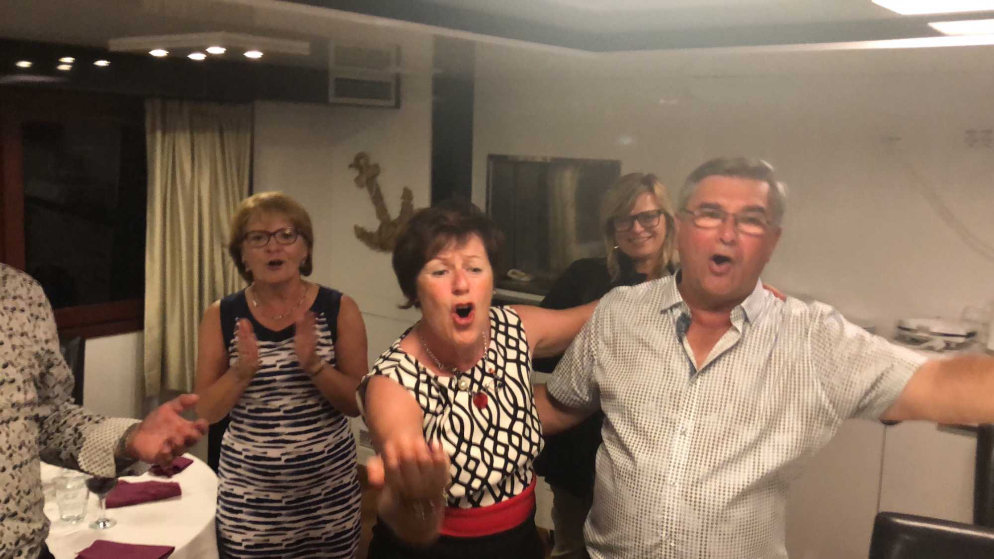 Ce soir, c’est le souper du capitaine! Quel festin nous avons droit. Vraiment tout est délectable. On jase, on rit, on a beaucoup de plaisir à être tous ensemble. Quand le navire est privé, c’est facile de faire lever un party et nos joyeux lurons s’en sont donnés à cœur joie. Chansons, joueurs de cuillères, danseurs nous avons tout eu ce soir. Il est là le bonheur!