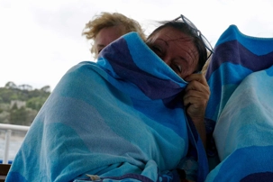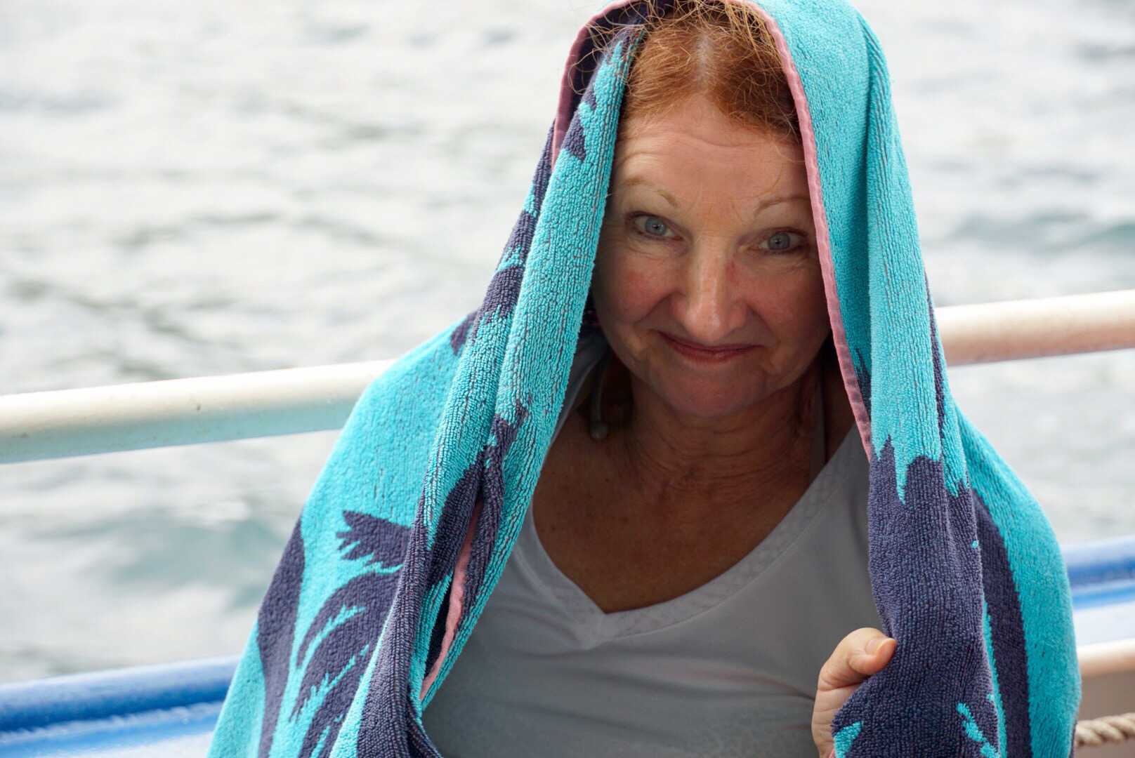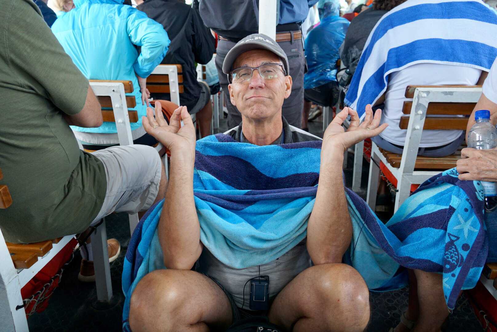 Chanceux, nous avons atteint l’île avant que le ciel se décharge sur nous. Nous avons oublié la visite de l’île et nous nous sommes attablés pour prendre un chaud café réconfortant en attendant que le temps change. Le vent toujours présent, mais moins fort, nous avons repris le petit bateau pour revenir à l’endroit de notre baignade.