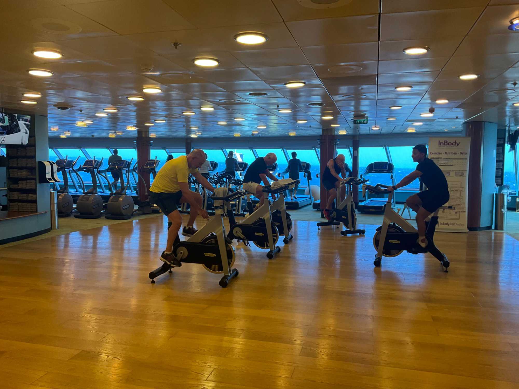La piste de marche et jogging a également trouvé preneurs pour 45 minutes ; qui dit mieux? Nous étions 8 voyageurs à marcher en placottant ici et là. On veut diminuer le taux de calories …tout en sachant que nous en reprendrons aux repas suivants. Le régime, c’est pour demain. J’ai beau être allé fouiné au gym 2 fois, je n’y ai trouvé aucun de mes passager. À la prochaine journée en mer peut-être? Il y avait là une balance mais chut, on ne le dit à personne, on ne veux même pas savoir combien de livres on prendra pendant la croisière. Ici, la croisière s’amuse!