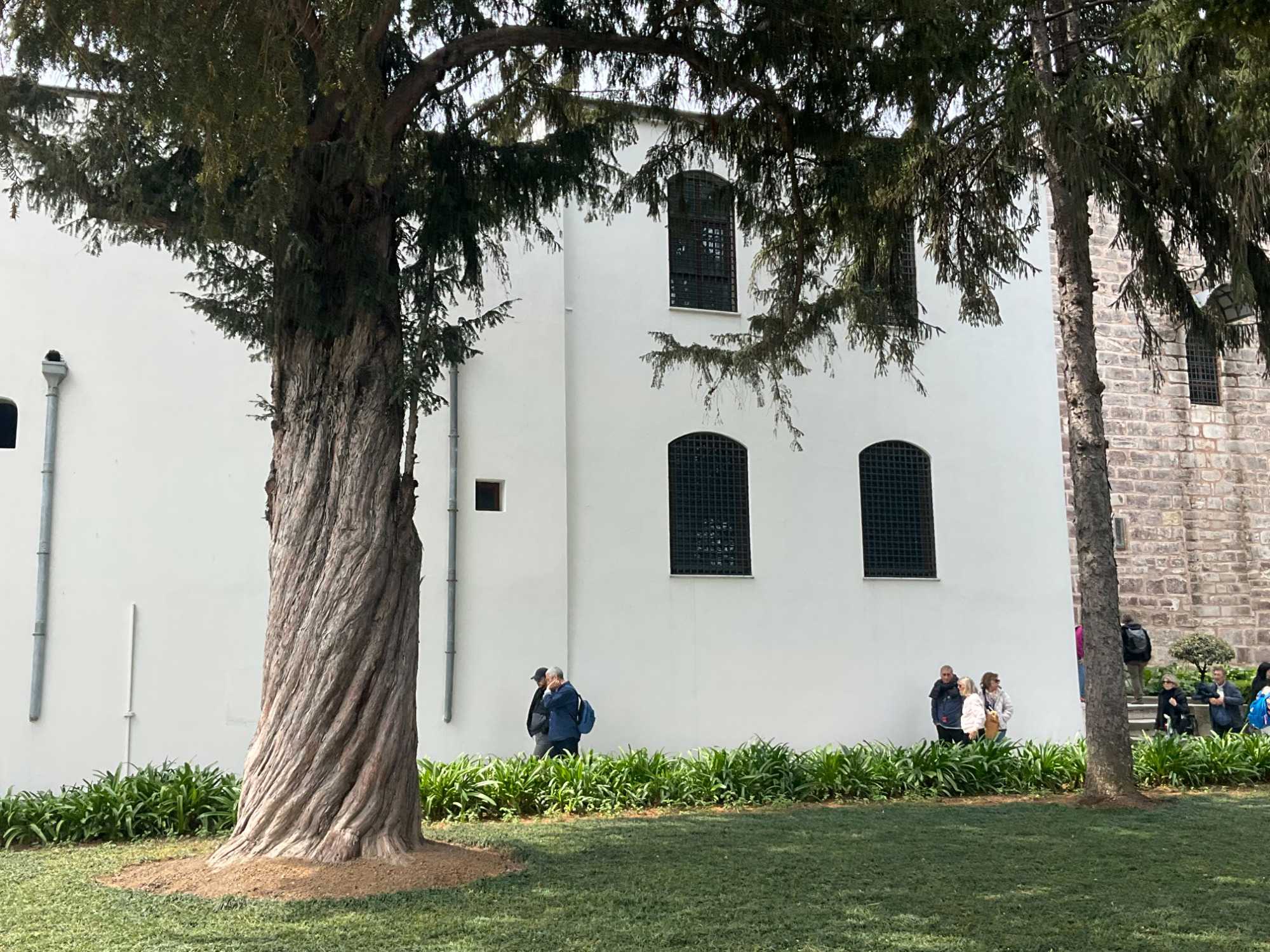 La construction du palais impérial commencée en 1459 a connu par la suite, de nombreux agrandissements : la construction du harem au cours du XVIe siècle, ou les modifications après le séisme de 1509 (pas étonnant qu’en 2023 la Turquie ait eu également de forts séismes de 7,8 de magnitude) et l'incendie de 1665. Notre guide nous fait remarquer que le palais est un complexe architectural composé de quatre cours principales et de nombreux bâtiments annexes. Avec les sultans successifs, s’est développé, un grand complexe d’ensemble de bâtiments dans de beaux jardins. Au plus fort de son existence comme résidence impériale, il abritait plus de… 4 000 personnes et s'étendait sur une zone encore plus vaste. On n’osait pas demander combien de femmes composaient alors le harem…mais finalement …on l’a demandé. Tenter un chiffre. …125, du moins pour le sultan surnommé Abraham le fou, qui aurait eu 110 enfants (un peu moins que dans le film Starbuck mais quand même pas si mal). Ces concubines étaient en fait de jeunes esclaves d’à peine 14 ans et dès 26 ans elles étaient déjà « à la retraite ». Le quartier des favorites étaient pourvu de grands foyers et de vastes divans. Et pour compléter le tableau, le sultan avait droit à 600 servantes. Les eunuques, ces hommes castrés qui gardaient les femmes du harem ne devaient jamais voir ce qui se passait dans le harem. Ils marchaient avec des œillères et pour ce faire, on avait construit un pavé recouvert de pierres différentes du pavé particulier réservé aux femmes.