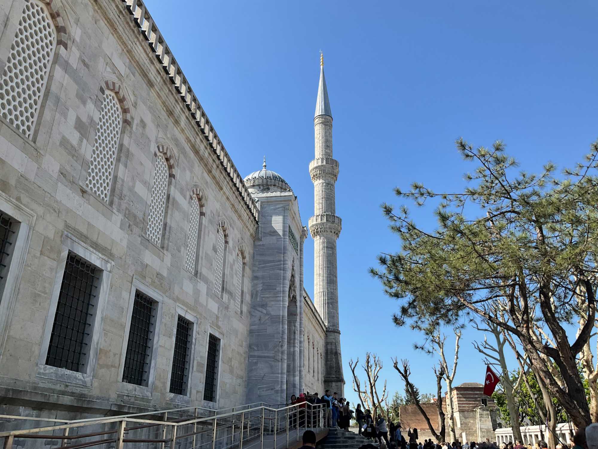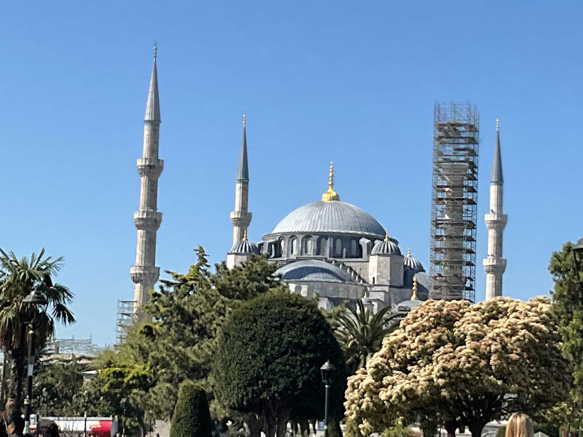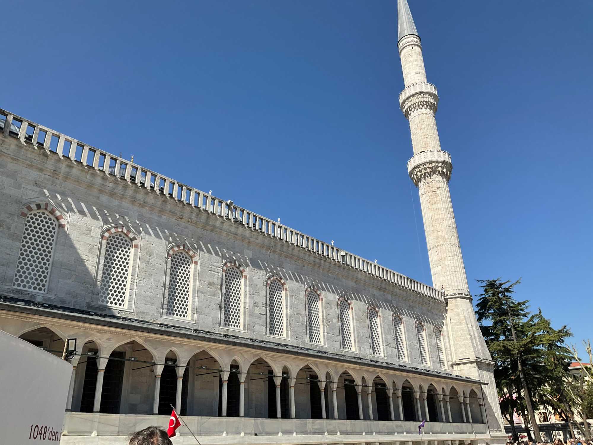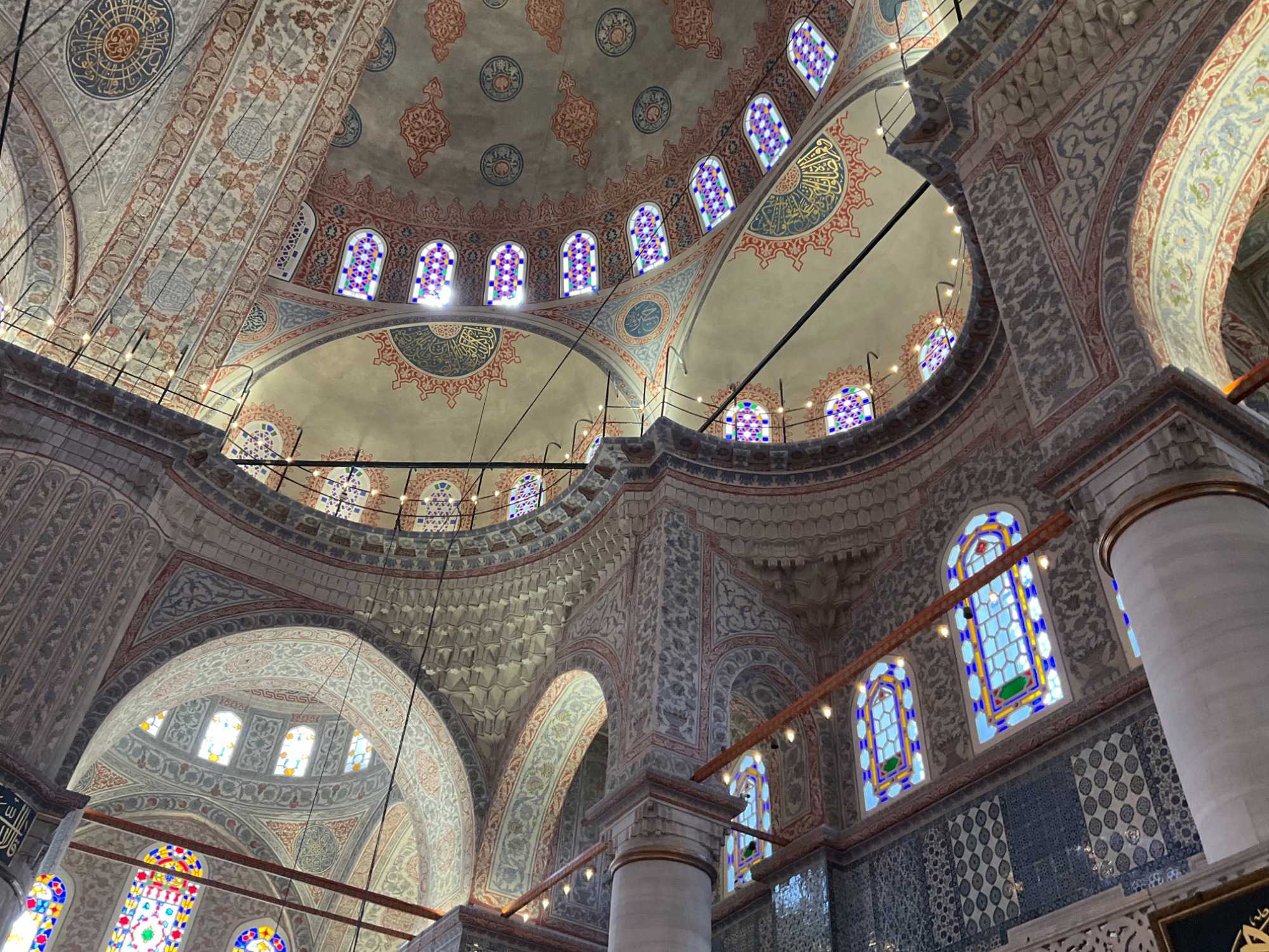 Entre 1609 et 1616, sous le règne du sultan Ahmet Ier a lieu la construction. Comme beaucoup d'autres mosquées, elle dispose également dans ses lieux, de la tombe du fondateur, une médersa (école religieux musulmane) et, un hospice. Nous ne pouvions manquer cette mosquée Sultanahmet car à ce jour encore, elle reste l'une des attractions touristiques les plus populaires d'Istanbul. Elle fut un point de départ du pèlerinage à La Mecque.Nous avons été fascinés par les six minarets et comme tous ses visiteurs, par la décoration intérieure des 21 043 faïences d’Iznik toujours à dominante bleue, un spectacle visuel sans précédent. Pas étonnant qu’elle appartienne au club sélecte du Patrimoine mondial (1985), au titre des zones historiques d'Istanbul.