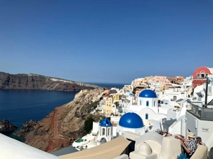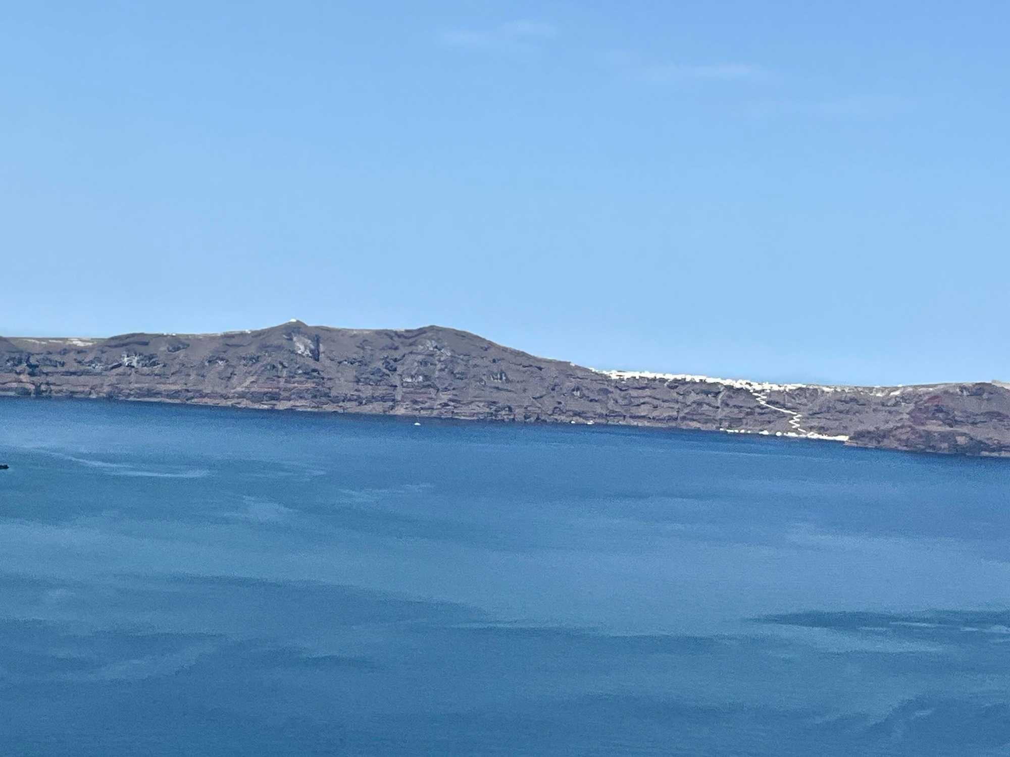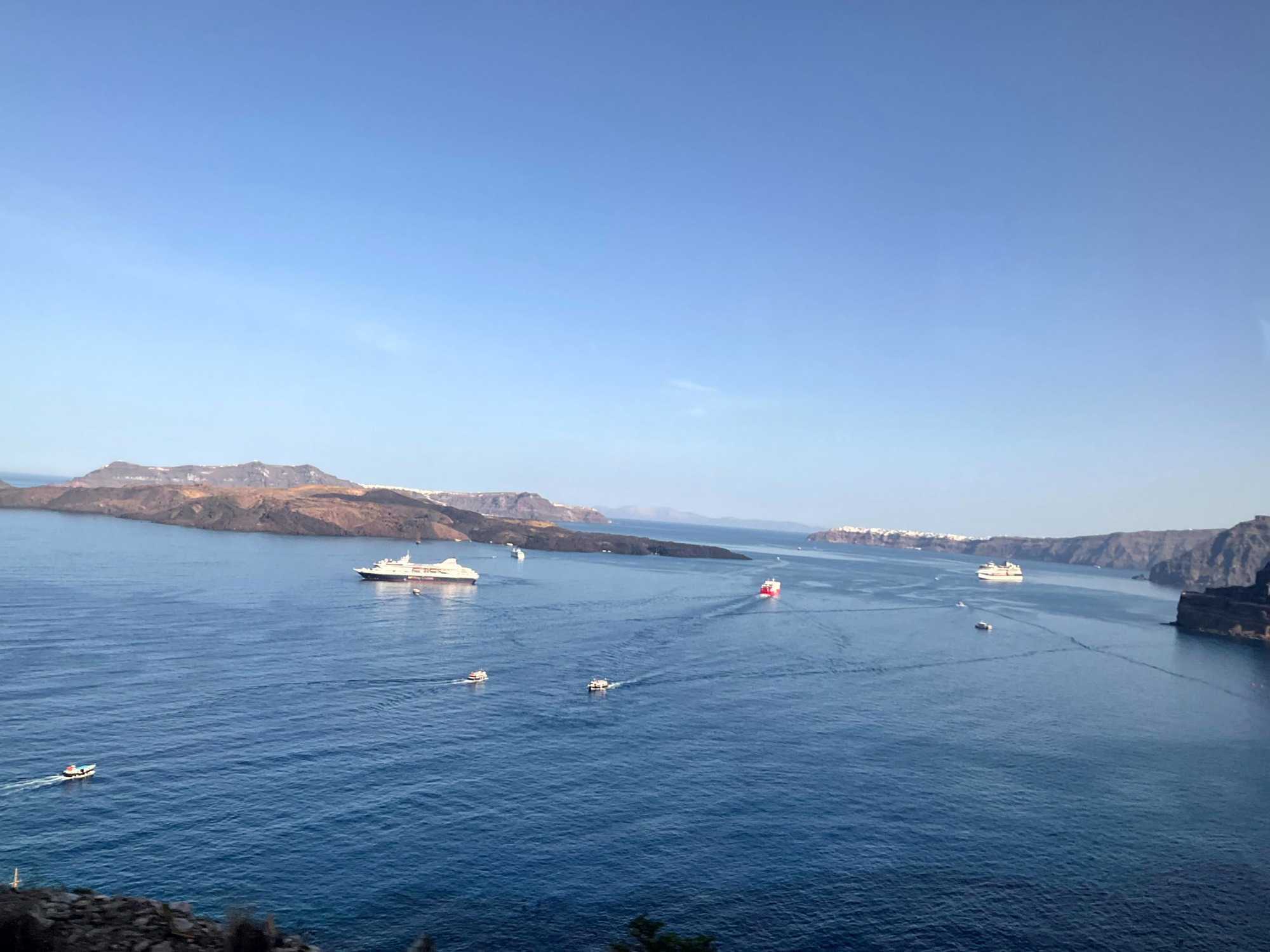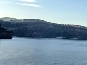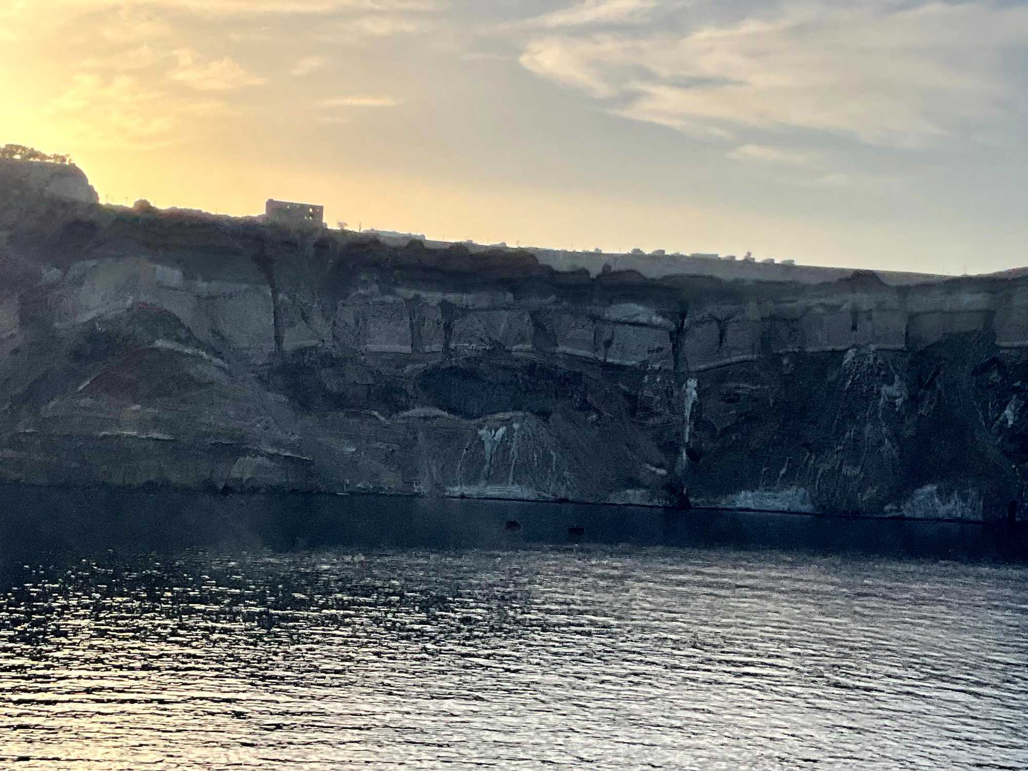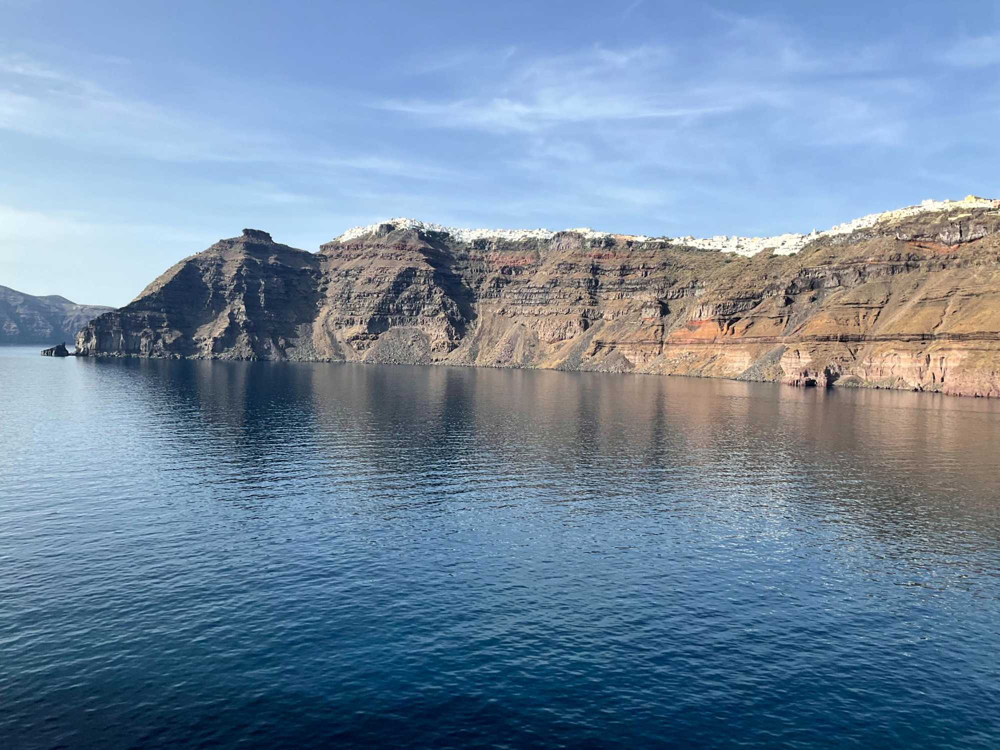 Ce matin, les lève-tôt ont pu apercevoir du pont, un chapelet de petites maisons accrochées sur les hautes falaises volcaniques de l'île de Santorini. En forme de croissant de lune, conséquence d’une éruption qui a détruit une grande partie de l’île vers 1600 av. J.-C.