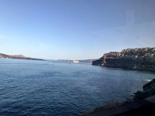Pour accéder à l’île, à partir de notre navire ancré près du port Athinios, nous avons pris un petit bateau appelé “tender” qui contient environ 200 passagers et sommes partis en mini-croisière de 10 minutes pour nous amener prendre notre autocar privé afin de se rendre à Oia, prononcé IA à la façon Michel Barrette.