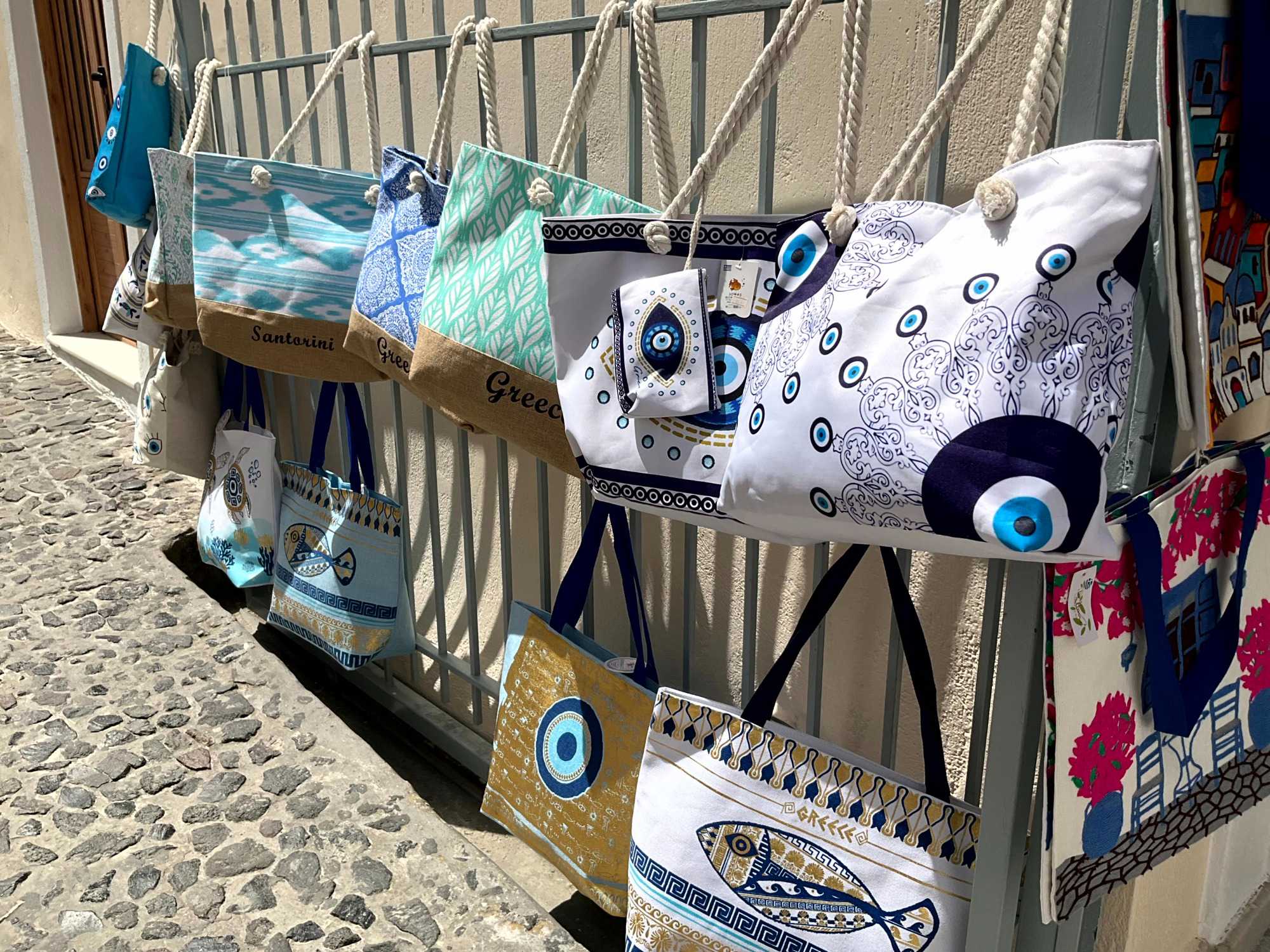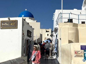 On déambule dans le village hautement perché à travers les étroites ruelles garnies de boutiques aux arts variés alternant des peintures aux poteries, aux foulards signés et aux bijoux savamment sculptés par des créateurs grecs, résultat des artistes qui ont visité Oia au fil des années, ont adoré le village et ne l'ont jamais quitté. Quelle chance on a avec cette journée ensoleillée d’être le seul gros navire de croisière ce matin, la circulation piétonnière demeure dense à travers ses petites ruelles. Nous, Canadiens habitués à nos grands espaces, cette proximité ne nous est pas familière.