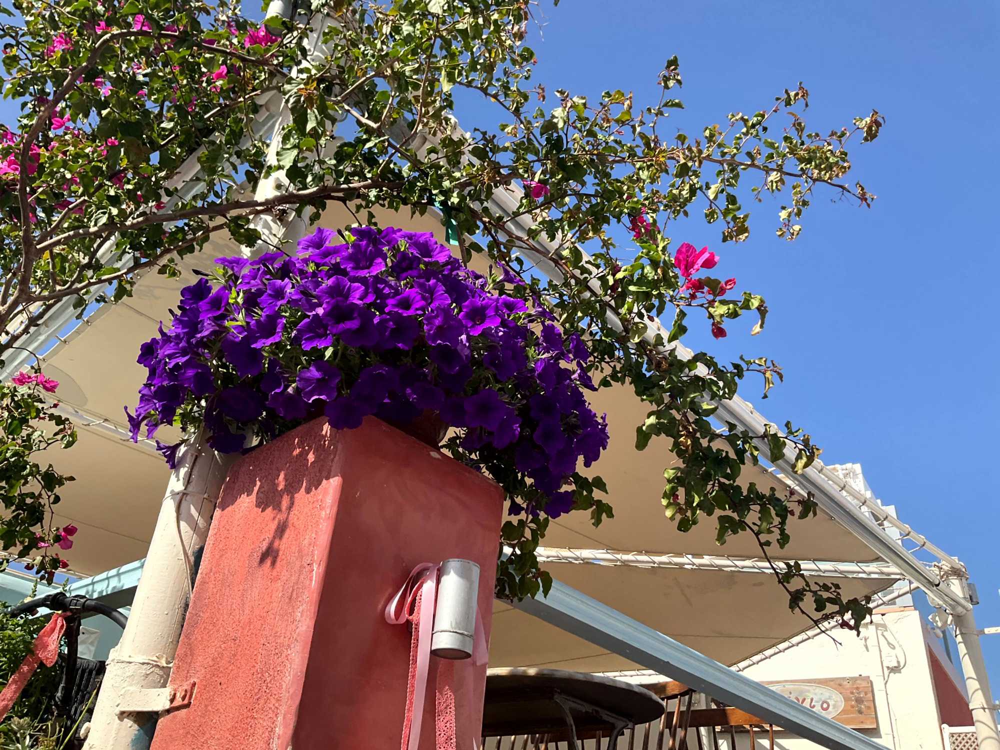 Particulièrement au sud de l’île, l’eau se fait rare et c’est à l’aide de citerne sur le toit que l’eau est emmagasinée dans chaque logis. Santorini ne possède pas de sources naturelles d’eau douce. L’eau est importée de la Crète voisine ou obtenue par dessalement de l’eau de mer. On est loin de nos 500 000 lacs au Québec et de notre “or bleu”.