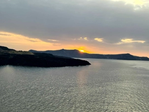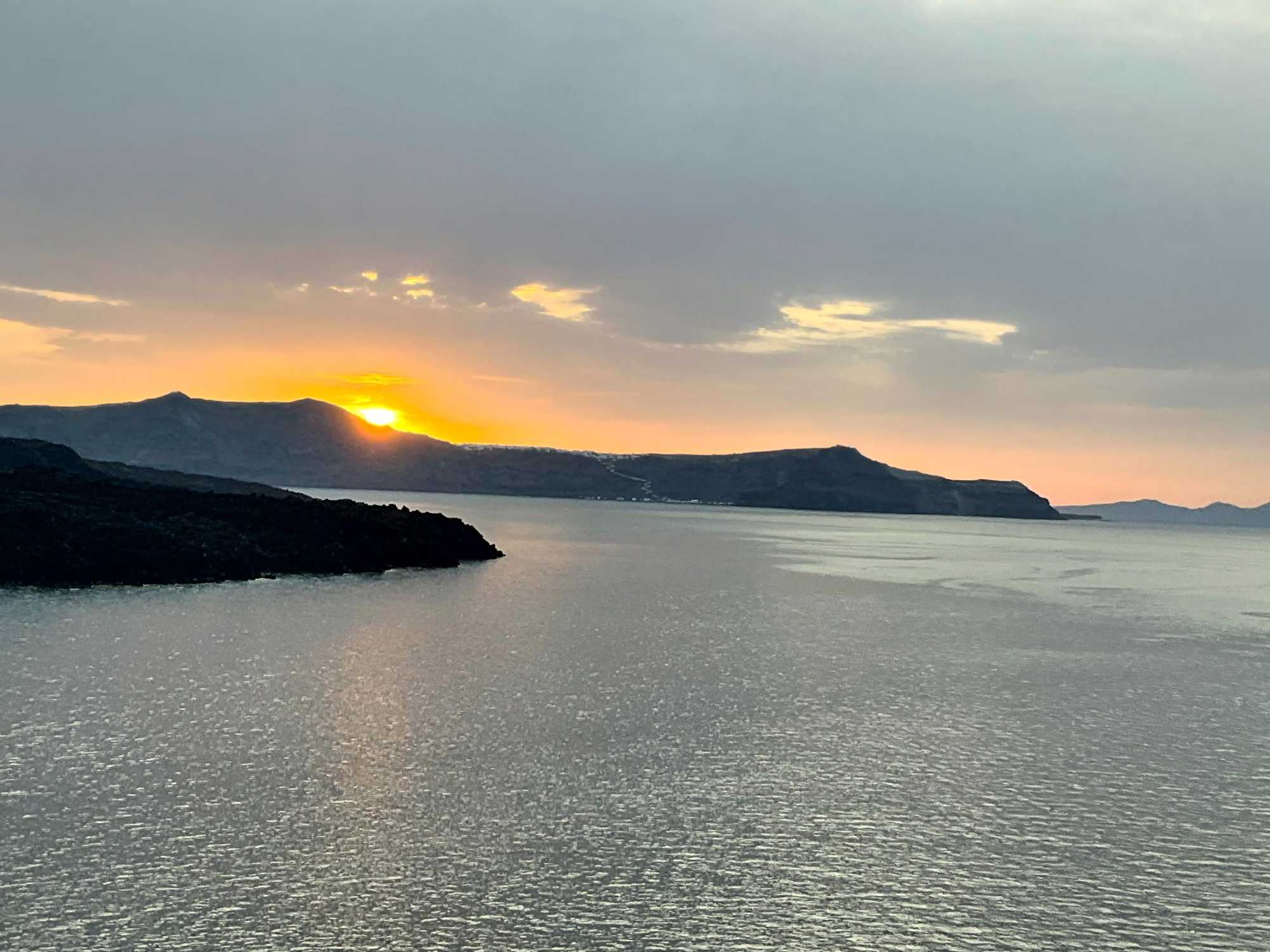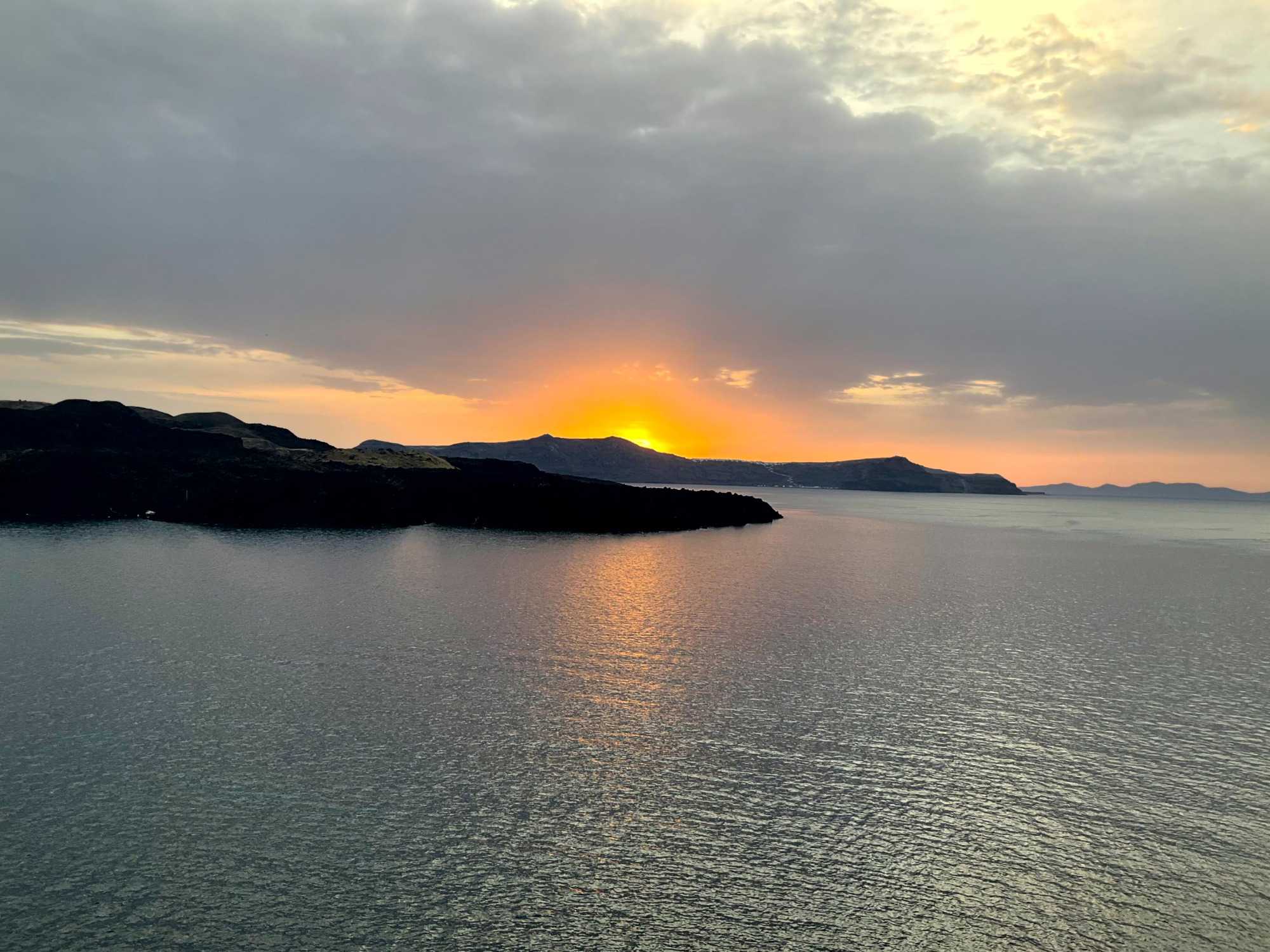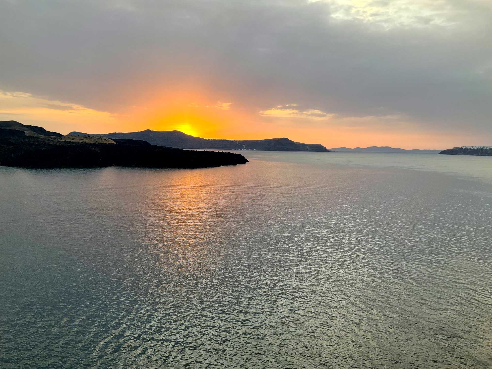 La dernière chose mais non la moindre, les couchers de soleil de Oia. Leur célébrité rassemble des foules chaque soir pour les regarder. Bon nombre d’entre-nous avons filé en douce dès la dernière bouchée de notre croustillant au chocolat avalé directement les ponts 4 ou 11. De là, on a pu admirer le spectacle, reconnu parmi les plus beaux couchers de soleil au monde. Comme dans un film, la vie s’arrête. Tout le monde n’a d’intérêt que pour la lente descente de l’astre. La beauté du spectacle est inouïe, captivante voire hypnotisante, c’est ça le St-Graal de la journée, de l’île de Santorini.