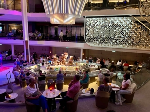 On se rend au buffet de l’Oceanview Café pour le dîner. Différents îlots de plats préparés nous mettent l’eau à la bouche... La configuration du buffet est vraiment originale avec ses îlots. Ceci permet de retrouver toute la nourriture au centre de la salle et les voyageurs vont aux tables installées de chaque côté du navire avec vue sur la mer. En plus du Ocean Café, nous pourrons profiter d’une grande variété culinaire offerte par un total de 32 restaurants, bars et salons uniques.