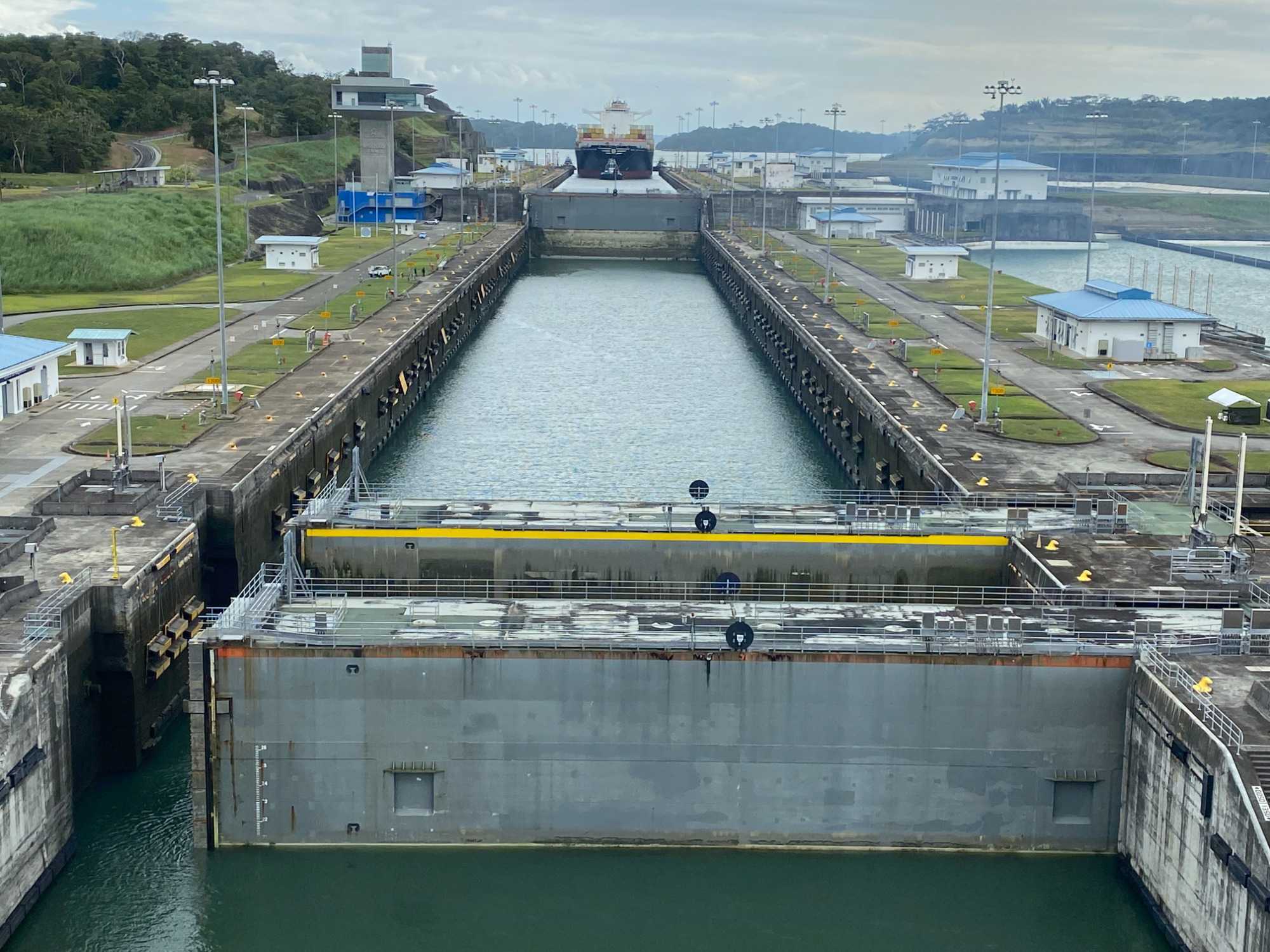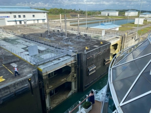 Vers 7h, le Beyond débute sa traversée des écluses de Gatún qui comportent 3 étapes pour une longueur totale de 1.9km. La traversée des 3 écluses prend environ 2 heures, permettant suffisamment de temps aux voyageurs d’admirer le fonctionnement de celles-ci. C’est impressionnant de pouvoir voir de près la mécanique de ce système: elles sont larges de 33.53m, elles ont 304,8m de longueur et une profondeur de 12.55m. Chaque chambre est remplie avec 101 000m cubes d’eau. Le canal de Panama est, selon l’Association Américaine des Ingénieurs en Génie Civil, la 7e merveille du monde moderne.