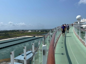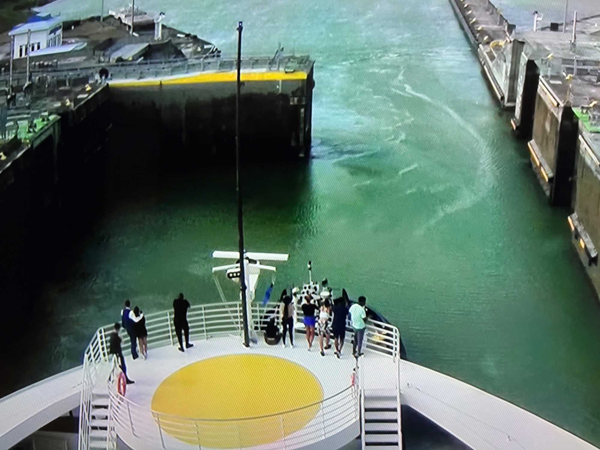 Plusieurs voyageurs s’empressent d’aller à l’extérieur sur les différents ponts du navire. Un pilote du Panama est monté à bord afin de passer la prochaine étape, les écluses Gatun. Ces écluses sont en fait une série de trois écluses, un peu comme une cascade de trois niveaux qu’il nous faut monter sur une hauteur de 26 mètres au total pour arriver sur le Lac Gatun. Comme un saumon remontant les cours d’eau pour aller frayer dans la rivière où il est né; sauf que pour nous, c’est le navire qui fait tout le travail ! La traversée des 3 écluses prend environ 2 heures, permettant suffisamment de temps aux voyageurs pour admirer le fonctionnement de celles-ci. Un bateau remorqueur est installé à l’avant du navire et un autre à l’arrière pour le faire avancer sans accrocher les côtés du canal. C’est impressionnant de pouvoir voir de près la mécanique de ce système. Tout au long de la journée, il y a eu un commentateur, monsieur Jim Clement, pour nous donner des explications sur le canal. Nous avons donc admiré le processus du passage des écluses, une après l’autre, tout en étant bien informé sur leur fonctionnement et leur histoire.