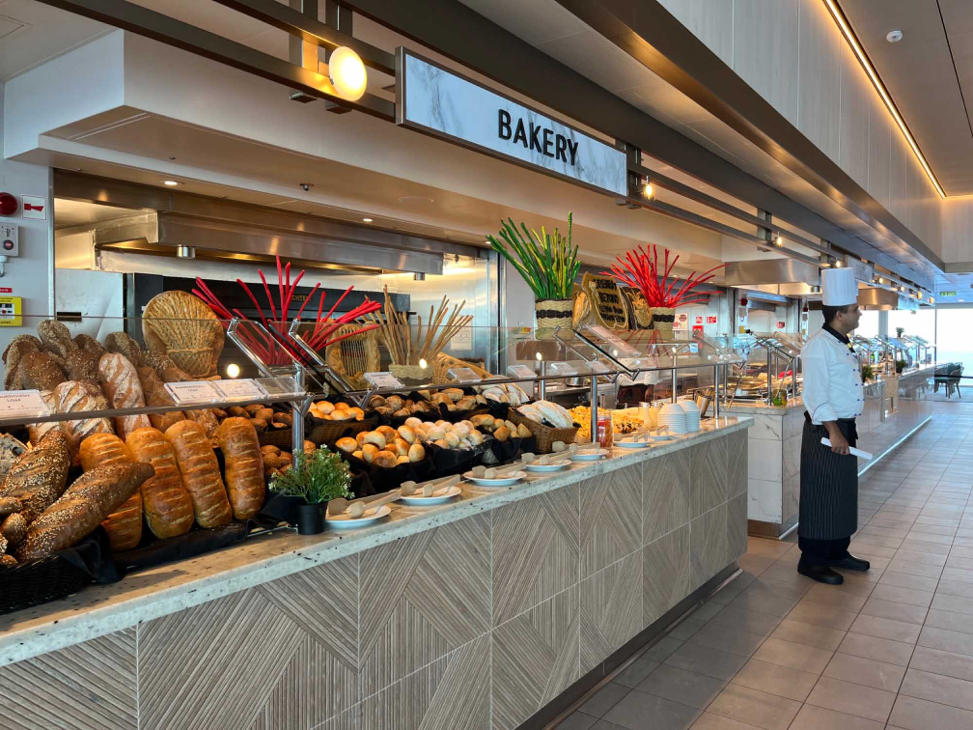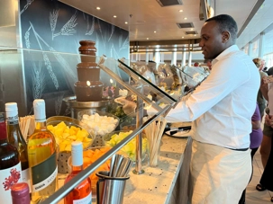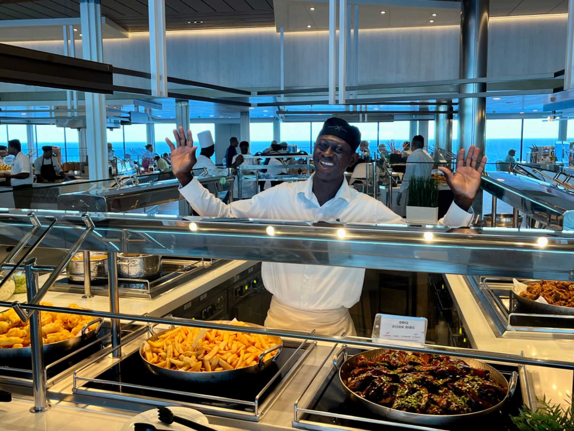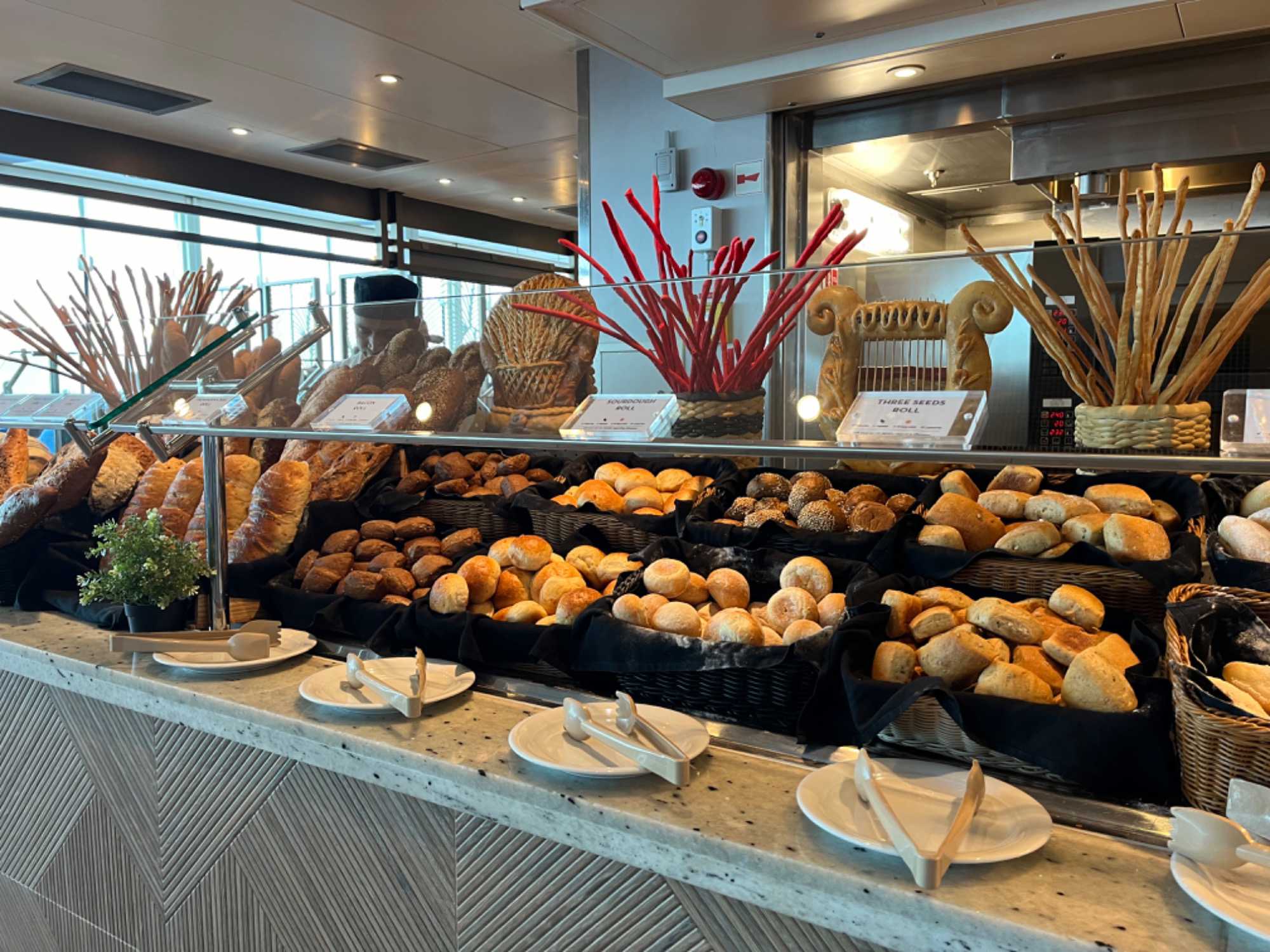 Puis, arrive l’heure de faire notre dîner collectif facultatif. Ce midi nous changeons d’endroit car l’équipe des cuisines nous a préparé le fameux « Buffet Extravaganza » au Oceanview café. Nous y allons, bien installés à des tables nous permettant d’admirer la mer et le ciel. On y voit que du bleu; le bleu foncé de la mer et le bleu pâle du ciel. Nous avons la chance de prendre un repas exceptionnel composé de roast beef, dinde, porc, fish and chips, crevettes géantes, salades, brochettes de fruits, pâtisseries et gâteaux irrésistibles. Tous les voyageurs apprécient vraiment les bons moments passés ensemble sur le navire.