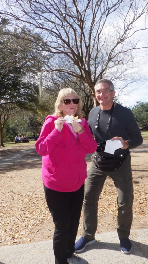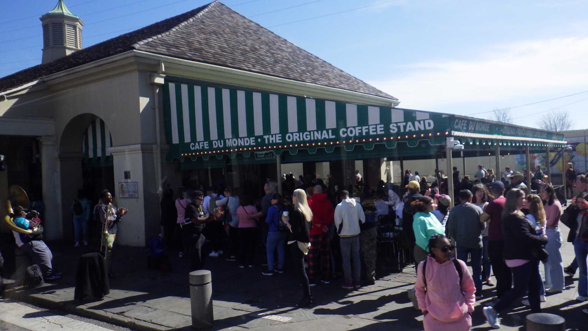 Après toutes ces émotions, nous partons en bus faire la visite de la ville même de La Nouvelle-Orléans, avec Gisèle. Elle nous fait voir que c’est bien plus que Bourbon Street ou même le quartier français; c’est une ville composée de quartiers fièrement distincts, avec leur histoire, leurs cultures au pluriel, car Dieu sait qu’elles sont multiples et complexes, chacune avec ses propres activités folkloriques ou muséales. Nous en avons aussi profité pour parler de l’horrible ouragan Katrina qui avait dévasté la ville en 2005. J’ai placé des photos montrant la démarcation de l’eau sur une maison et sur un panneau routier, ouf! Facile de comprendre que cet événement a marqué les cœurs et les esprits à tout jamais. Après cet instructif tour de ville de près de trois heures, un arrêt s’imposait au Café du monde afin de déguster un bon café et quelques pâtisseries.