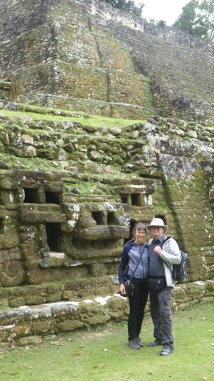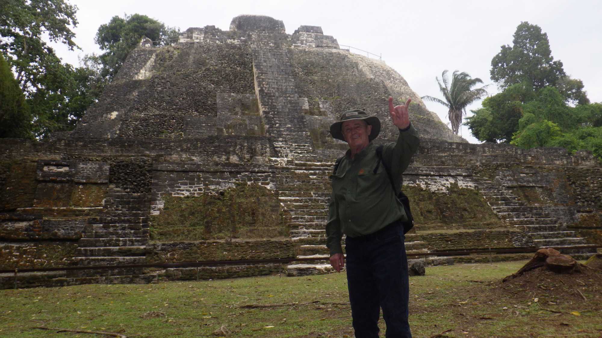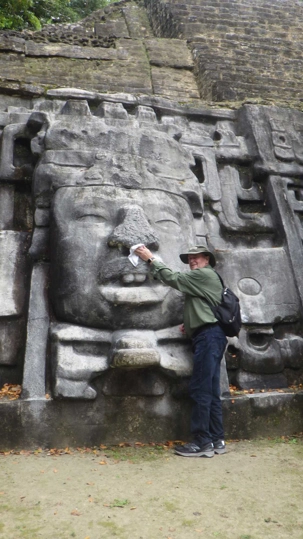 Je partage avec vous, chères lectrices et lecteurs, un soupçon de nos découvertes. Lamanai se trouve au nord du Belize près d’Orange Walk, dans le prolongement du Yucatan mexicain où s’est répandue la civilisation maya organisée autour de grandes cités. Lamanai fut l’une d’elles et bien que connaissant des hauts et des bas, son existence couvre 3000 ans d’occupation humaine, 3000 ans, c’est pas rien! Apparue dès la période préclassique, autour de 1500 av. J.-C., la cité a continué à fonctionner après l’arrivée des Espagnols et jusqu’en 1680, contrairement à la plupart des autres sites mayas. Cette exceptionnelle longévité pourrait s’expliquer par sa situation sur la rive de la New River, diminuant l’impact des sécheresses. Les travaux archéologiques n’ont commencé qu’en 1974 et ne concernent à ce jour que les monuments principaux, beaucoup de structures restent ensevelies sous la jungle. Les visiteurs sont relativement peu nombreux en comparaison avec des sites comme Tikal ou Chichén Itzá; on peut donc visiter tranquillement sans devoir composer avec trop d’interdits.