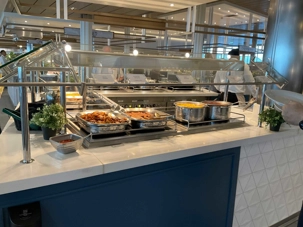 Comme je vous l’avais mentionné, certains profitent de cette première journée en mer pour se lever un peu plus tard ou…pour prendre un deuxième café…à la cabine en regardant défiler les vagues. Pour notre premier déjeuner à bord, le choix est gargantuesque. Et certains sont fait forts : la saucisse, le bacon… le saumon fumé. On devrait être bons pour se rendre au dîner.