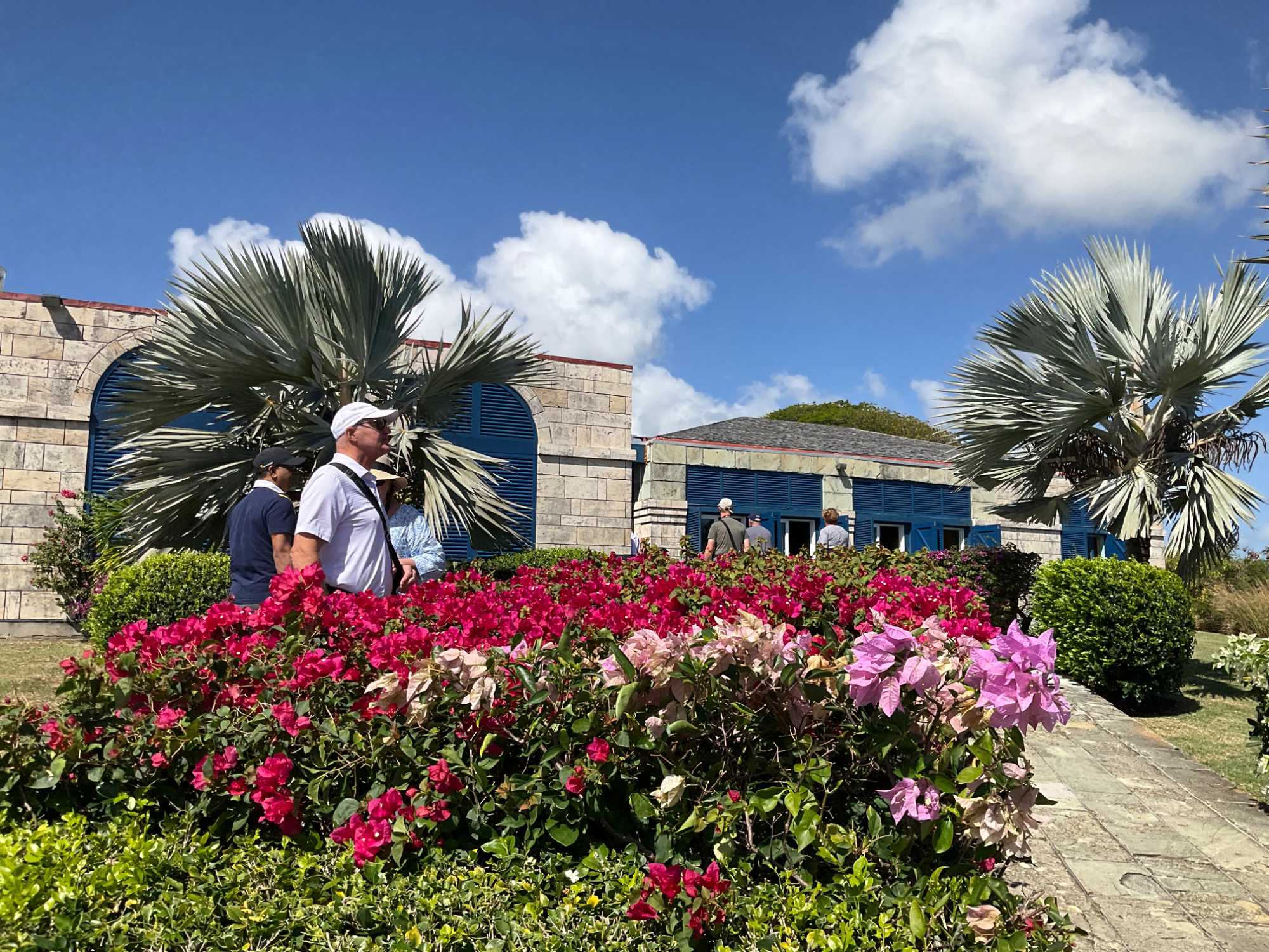 Pour les voyageurs qui ont opté pour l'excursion, en traversant le port, arrivé à un ensemble de petites boutiques, on rencontre notre guide, Georges, un habitant typique de l'île. Dès les premiers instants, on le trouve sympathique avec son rire contagieux et son sens de l'humour remarquable. Avec notre chauffeur, notre guide nous amène vers un endroit qui date du XVIIIe siècle, Dow's Hill, juste en haut sur la colline d'où l'on aperçoit English Harbour juste en-dessous, stratégiquement positionné pour voir l'ennemi arrivé.