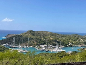Puis, on poursuit notre tournée exploratoire jusqu'à un belvédère appelé Shirley Heights. On apprend que cet espace a été utilisé pour la première fois pendant la guerre d'indépendance américaine (1774-1783) comme station de signalisation et comme poste de surveillance aux abords d'English Harbour, tiens tiens, un deuxième. Georges nous dit que la zone était bien adaptée pour assurer la sécurité du littoral d’Antigua. Une sentinelle pouvait repérer les voiles en approche et diffuser une alarme en utilisant des drapeaux pendant la journée et en tirant des canons de signalisation la nuit. Le système de signalisation d'Antigua était l'un des meilleurs des Caraïbes, et toute l'île pouvait être en alerte et savoir où marcher dans les 10 minutes suivant le premier signal. Bien organisé ces antiguaiens non? On y retrouvait même des casernes pour les soldats, des citernes d'eau et des plates-formes d'armes à feu y avaient éte ajoutées pour assurer la sécurité du chantier naval en contrebas à English Harbour. Mais nous aujourd'hui, on profite de ce deuxième belvédère pour observer la vue sur English Harbour et le chantier naval... mais dans un but pacifique et...contemplatif. Décidément, le spectacle vu d'en haut, avec ce soleil radieux sur l'eau turquoise et ses voiliers au quai, fait rêver.