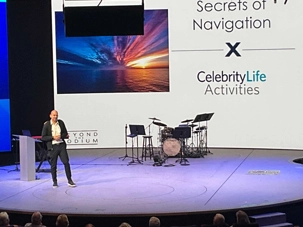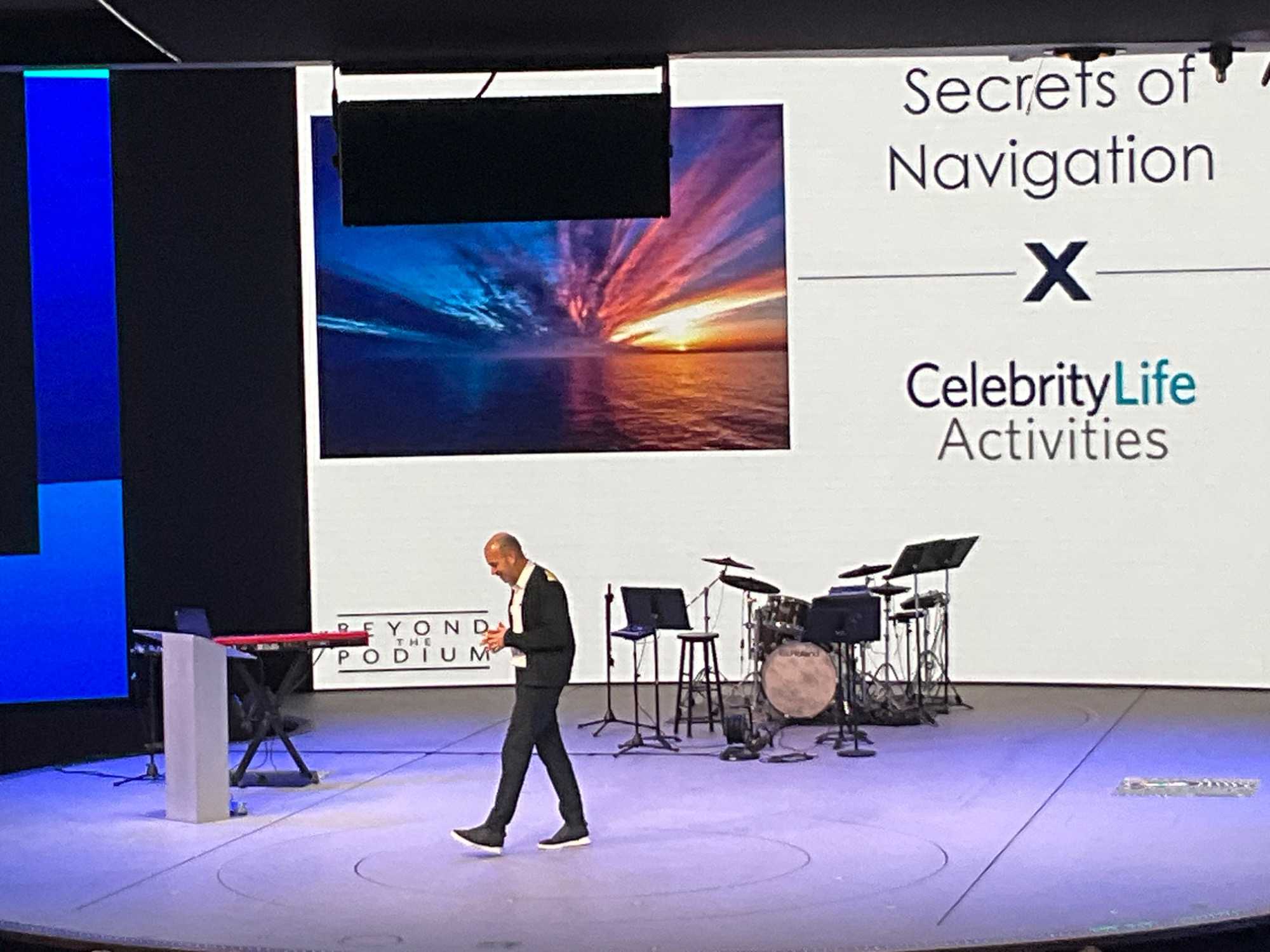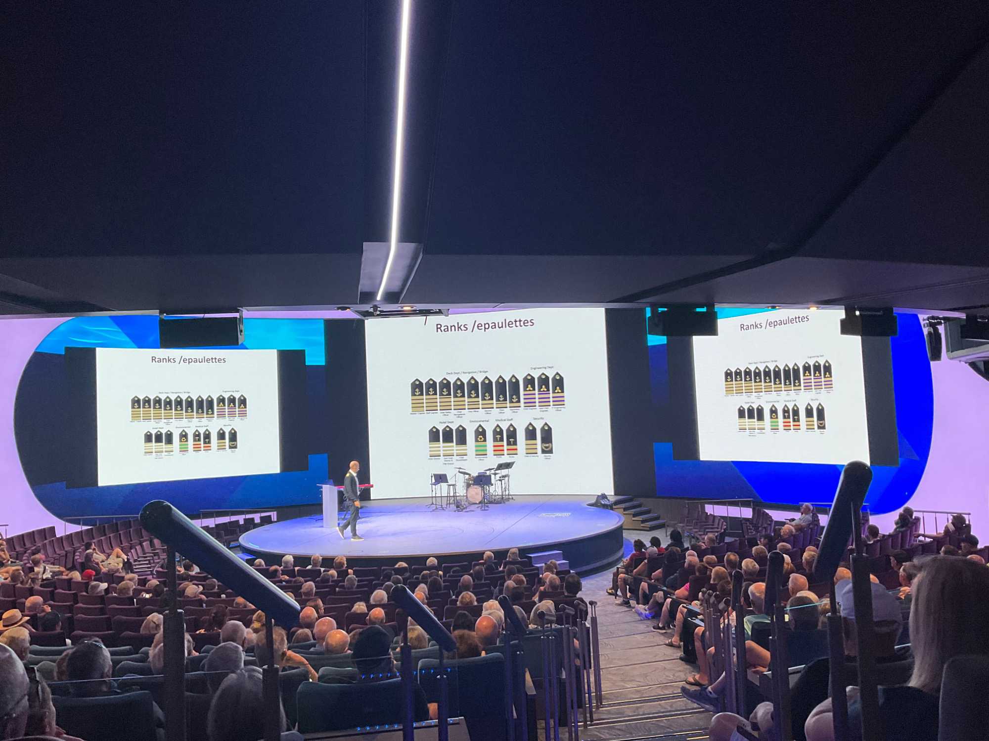 Mais, soleil ou non, bon nombre d'entre-nous se donne rendez-vous au théâtre en milieu de matinée pour la présentation du capitaine Kirk , et oui, on ne l'invente pas, comme le capitaine Kirk dans notre émission de jeunesse Star Trek. Tout y passe sur les principes de la navigation: organigramme de l'équipage, matériel, machinerie...Il est tellement charismatique que même nous les dames on en vient à s'intéresser aux turbines à gaz et aux moteurs diesel. On ne serait pas prêtes à prendre la barre du navire, mais pas loin HiHi! Son accent grec très mignon en fait un communicateur vulgarisateur hors pair. Bref, un bon moment où on met nos connaissances à l'épreuve tout en s'amusant grâce à ses talents d'humoriste.